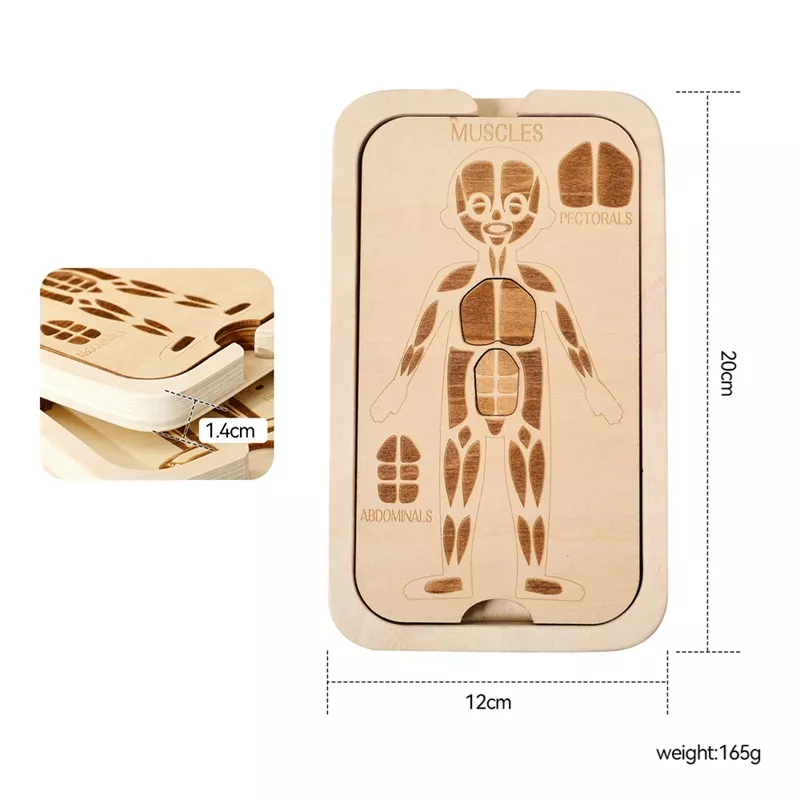 Crafted with high-quality wood and smooth, rounded edges, this puzzle is ideal for toddlers and young children. Each piece reveals a different layer of the human body — from bones and muscles to vital organs — giving kids a visual and tactile experience they’ll love. Sized at 7.87 x 4.72 inches, it’s compact yet detailed enough to captivate young learners.