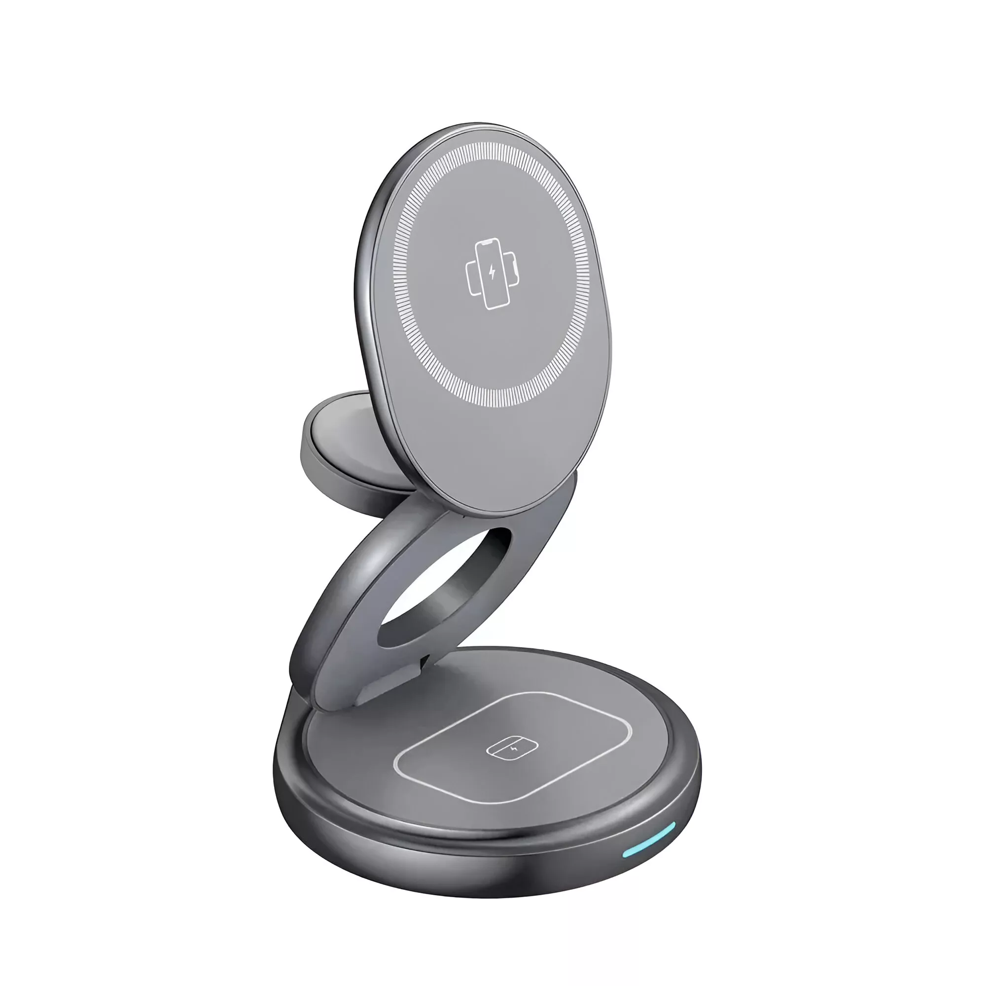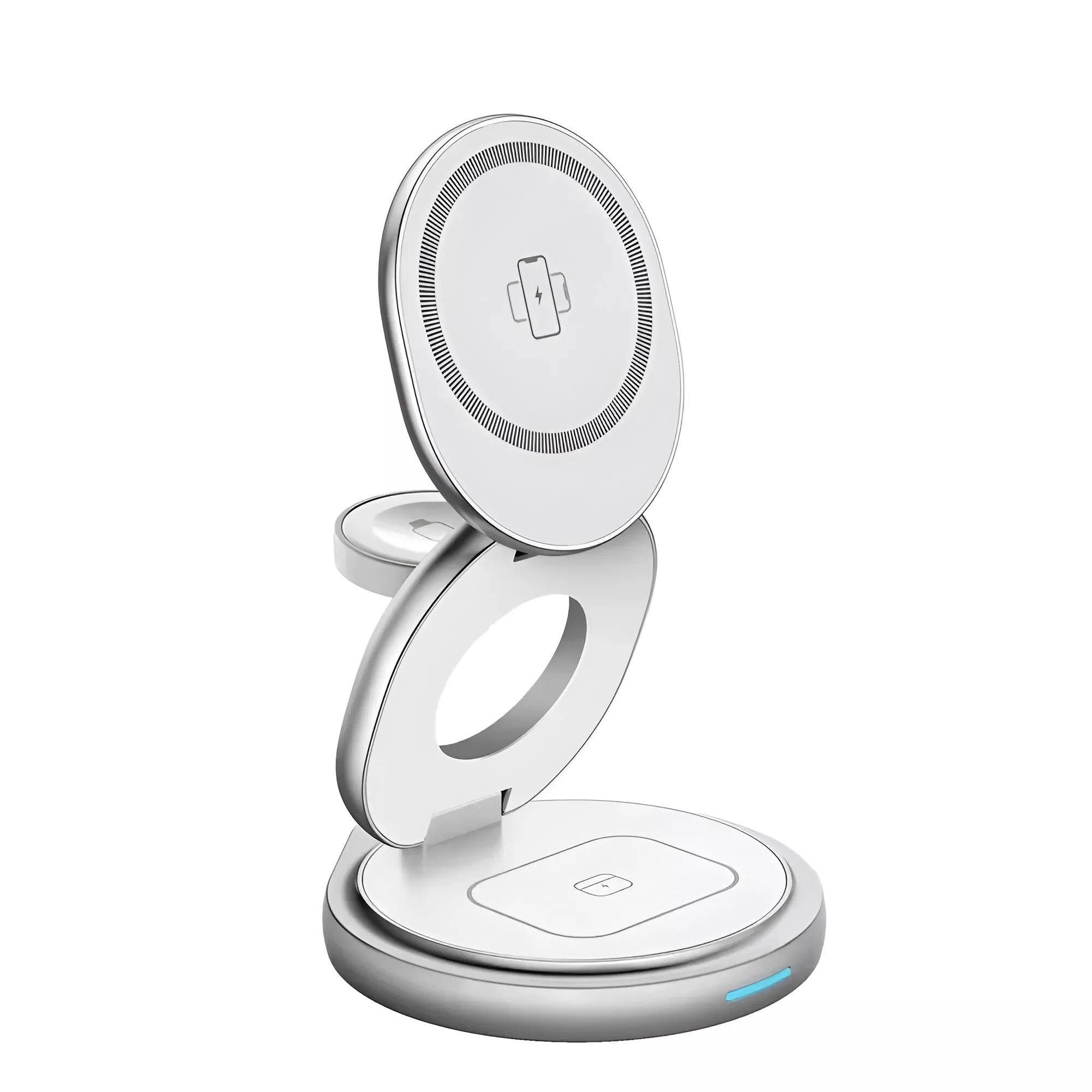 Power up your essentials in style with the 3-in-1 Magnetic Wireless Charging Station — the perfect all-in-one charging solution for your iPhone, Apple Watch, and AirPods. Designed for those who value efficiency and convenience, this charger stand features a sleek zinc alloy body that not only looks premium but also ensures better heat dissipation and faster charging performance. Whether at home, in the office, or on the go, this compact charger delivers powerful performance while keeping your devices neatly organized.