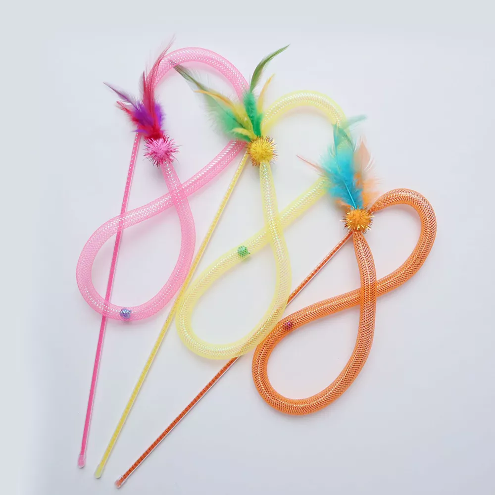Each cat wand is 15.7 inches long, ideal for keeping your hands safely away while your cat leaps and pounces. The feather materials are lightweight and irresistible to cats, while the elastic mesh tube adds an extra texture for tactile interest. Made from safe plastic and natural feathers, this set contains no harmful chemicals, ensuring your pet’s safety during enthusiastic play. These toys are simple yet effective in capturing your cat’s attention, suitable for kittens and adult cats alike.