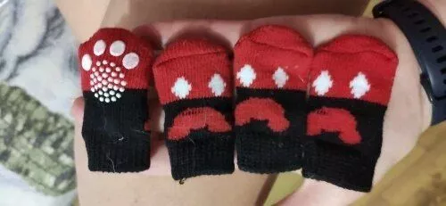 These socks are incredibly cute! I purchased them for my elderly black lab, who usually despises having her paws handled, yet she’s been comfortably wearing these all day. The only minor drawback is that, being socks, they can easily get wet or dirty outdoors. To manage this, I remove them whenever she needs to go outside and slip them back on afterwards. It's a slight inconvenience, but completely worthwhile. She's experiencing far less slipping on our wooden floors and finds it easier to get up while wearing them. This was a brilliant purchase, and I only wish I had discovered them earlier!