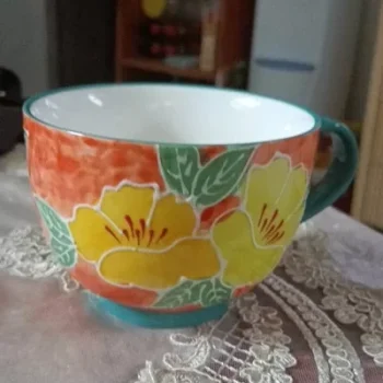 What a beautiful mug! The hand-painted flowers are so detailed, and the colors are vibrant. I love starting my day with a cup of coffee in this beauty.