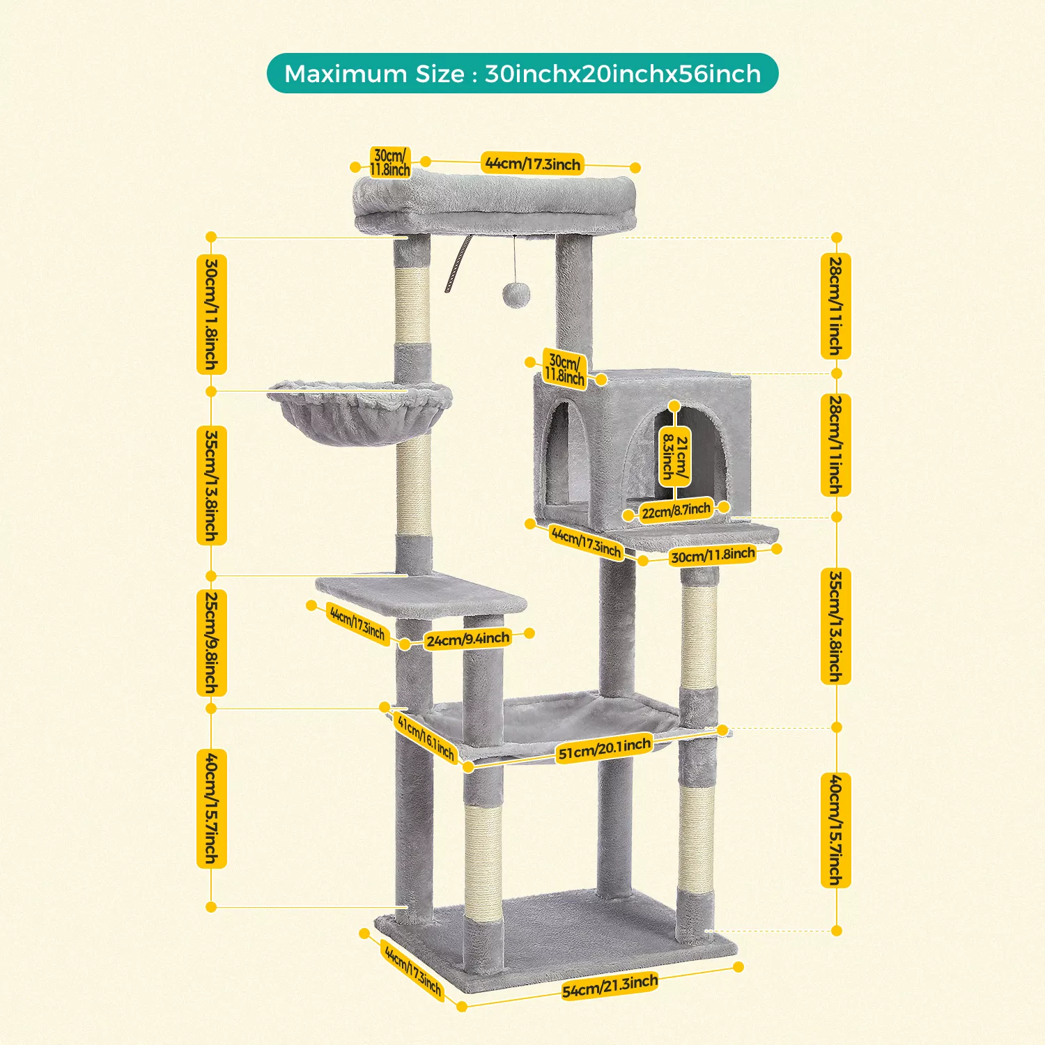 This cat tower isn’t just furniture — it’s a complete experience. The staggered levels are ideal for active play, helping cats burn energy and satisfy their love of climbing. Whether it’s a peaceful nap in the hammock, a territorial scratch on the sisal post, or a playful leap from tier to tier, every feature is designed to meet both comfort and entertainment needs.