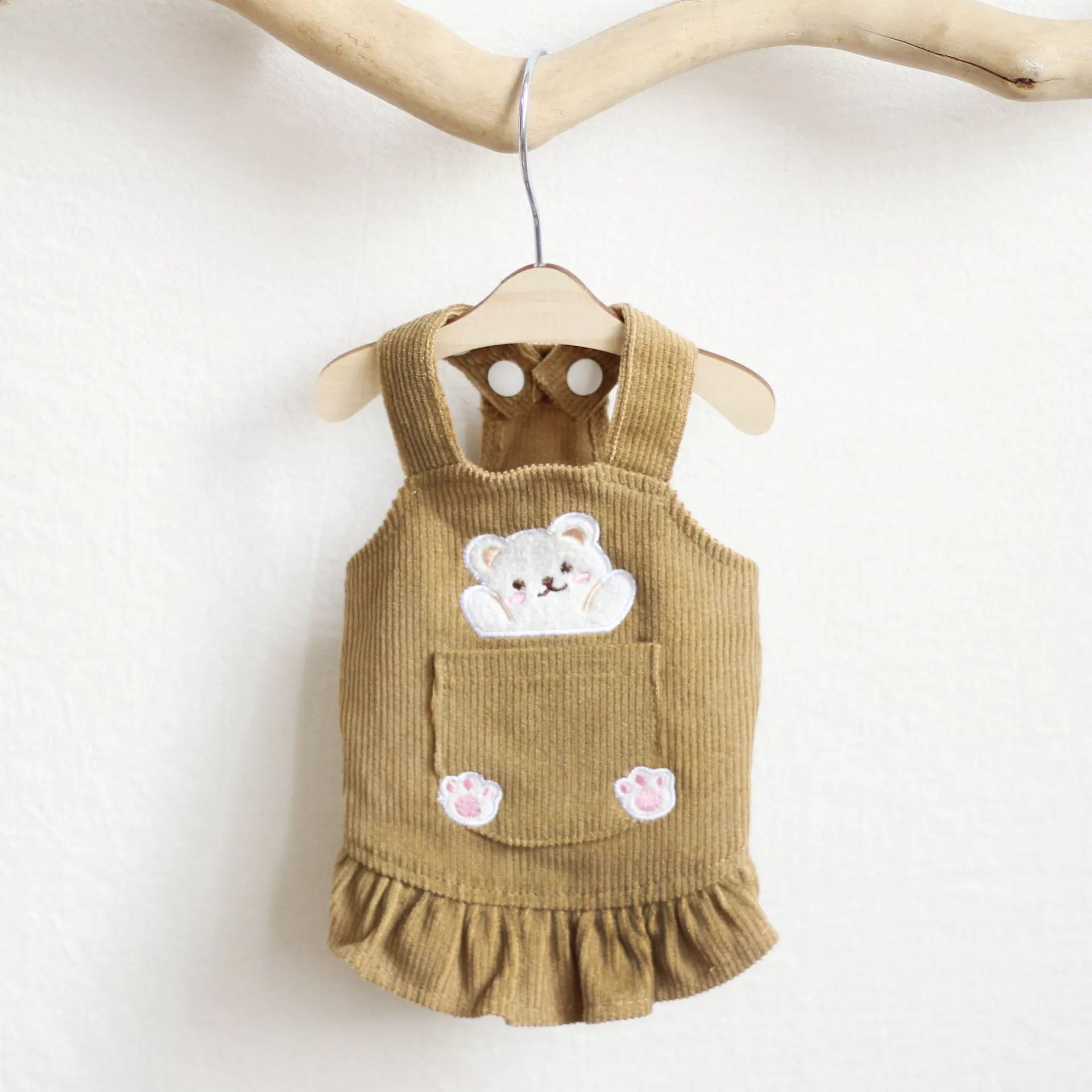 When I first saw this charming bear suspenders corduroy skirt, I was taken aback by its adorable design. My little feline friend has never looked cuter! The high-quality corduroy fabric is not only soft and cozy but also incredibly durable. What's more, the gentle nylon lining ensures all-day comfort for my pet without causing any irritation. The flying sleeve design adds a touch of elegance to her wardrobe that is simply irresistible. Dressing her up in it was hassle-free thanks to its easy on and off design – no more wrestling with stubborn outfits! It truly stands out from other pet outfits we've tried before - unique, eye-catching yet comfortable enough for everyday wear.