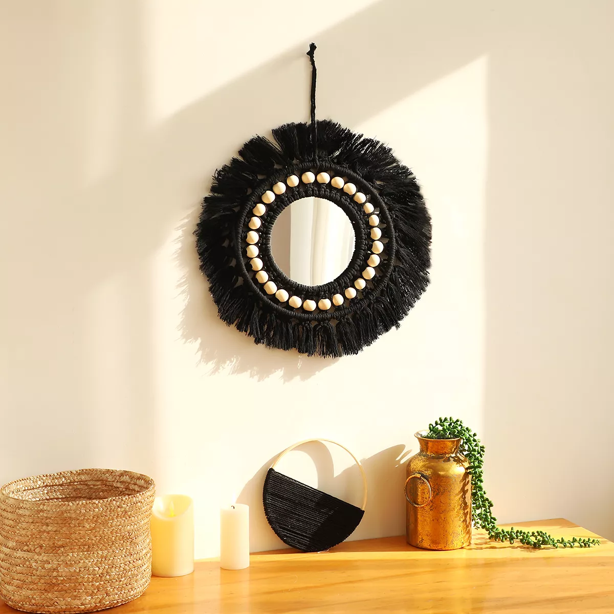Add a warm, stylish touch to your space with this Black Macrame Round Wall Mirror featuring wooden bead accents. The perfect blend of natural texture and modern charm, this mirror brings an effortlessly cool boho vibe into any room. Whether you’re designing a calming bedroom retreat, enhancing a minimalist hallway, or adding flair to a cozy living room corner, this piece makes a stunning focal point on any wall.