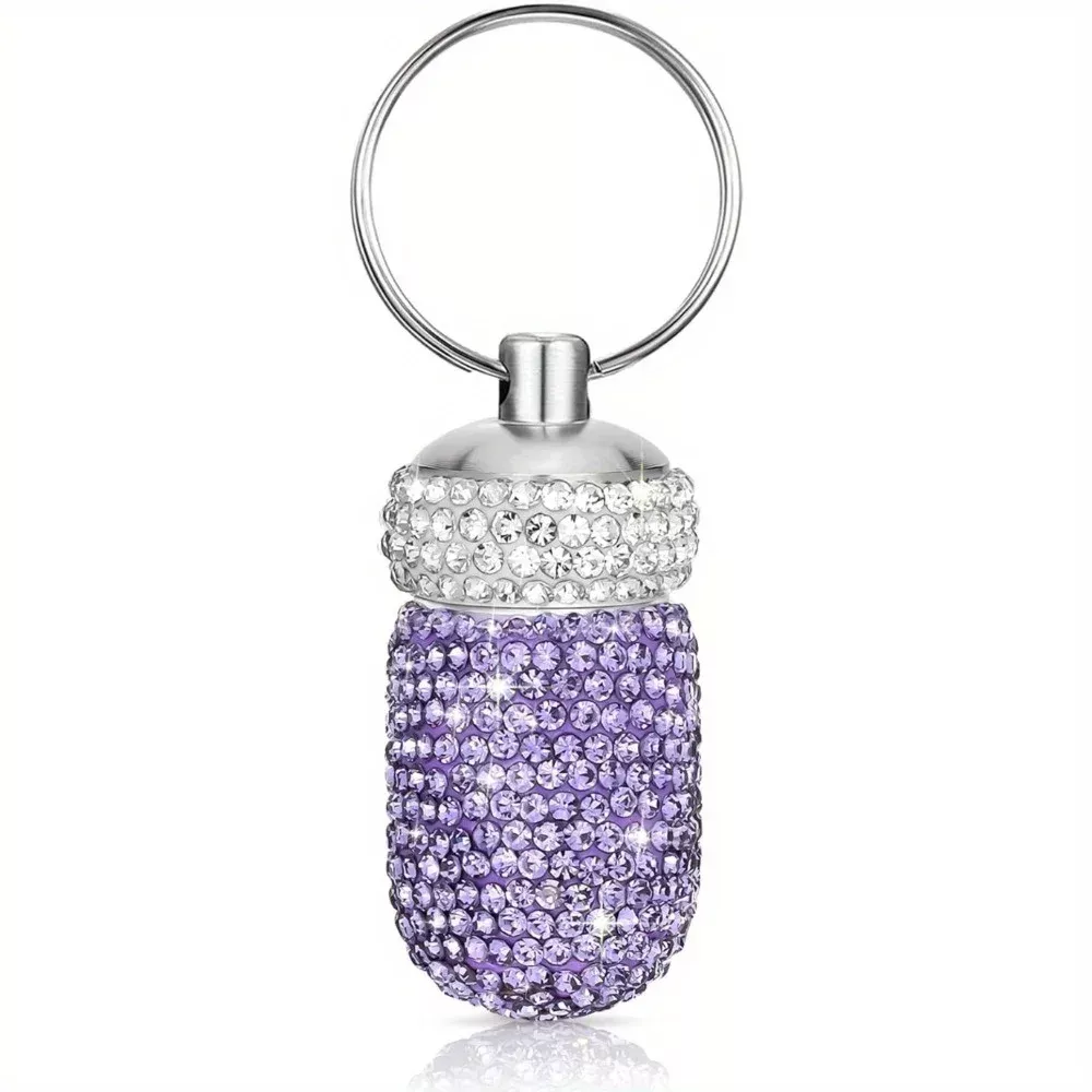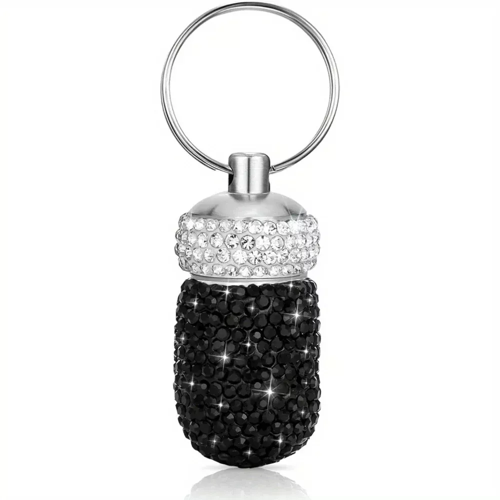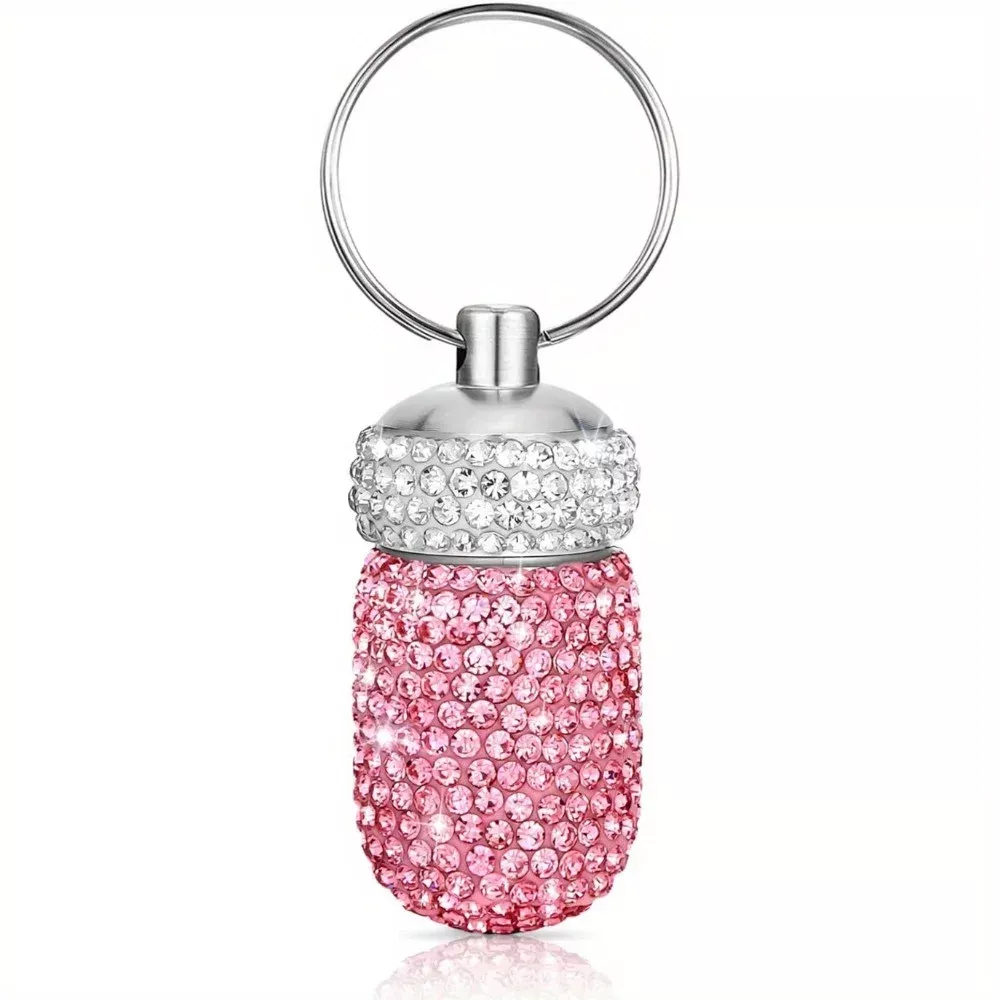 Bling Rhinestone Waterproof Pill Holder with Keychain – Travel Pocket Dispenser