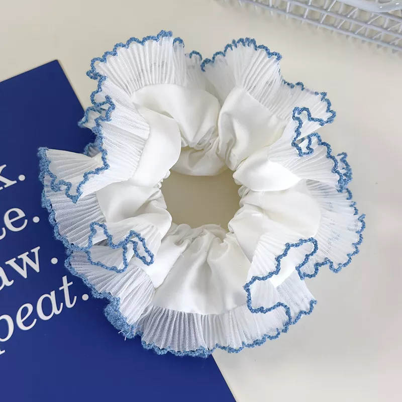Blue Lace Ruffle Scrunchie with Plaid Pattern