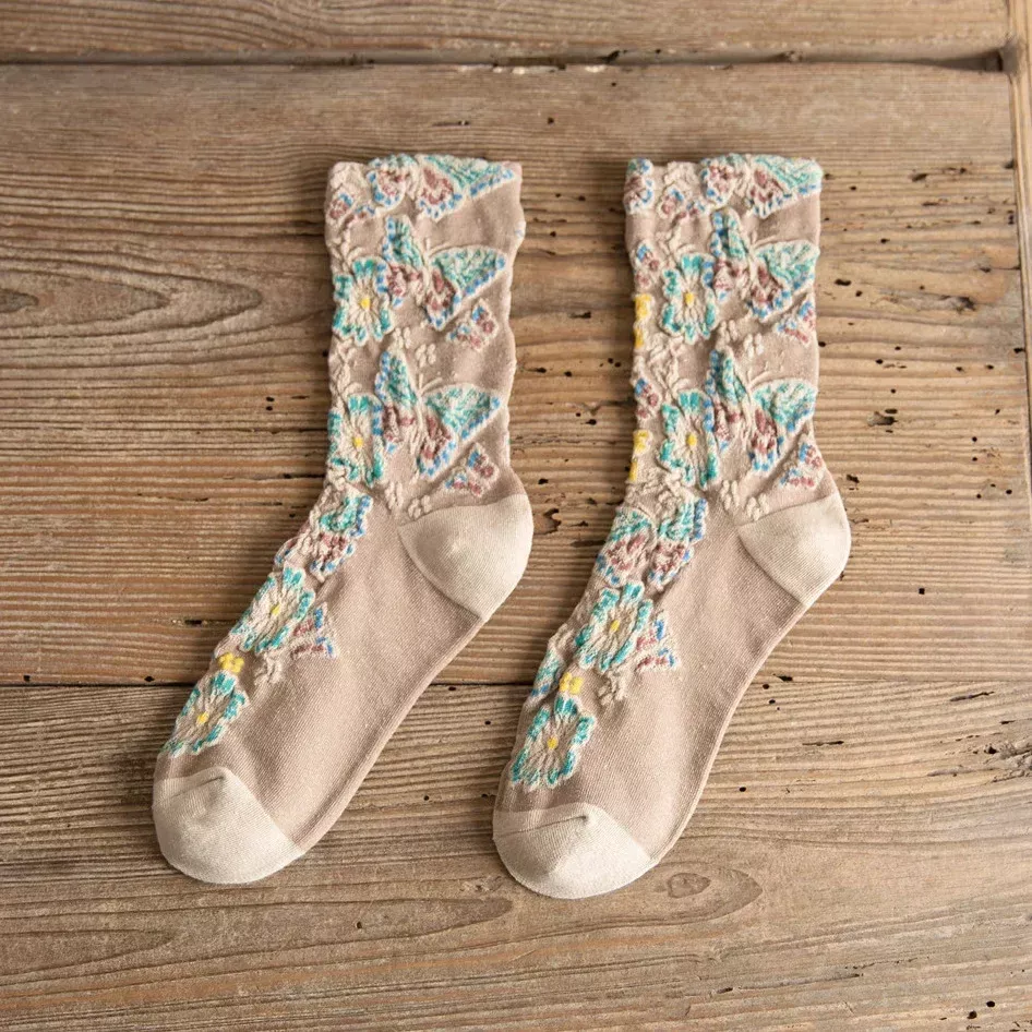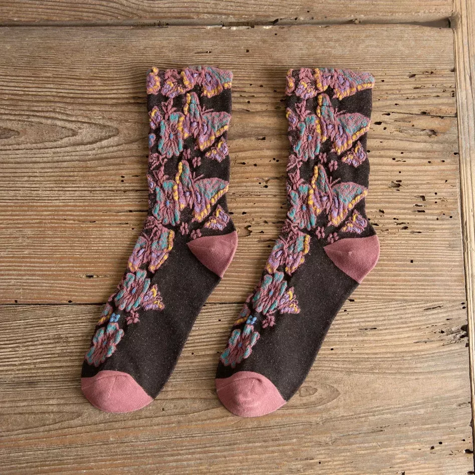 Butterfly Embossed Vintage Cotton Socks for Women – Cozy Autumn Winter Style