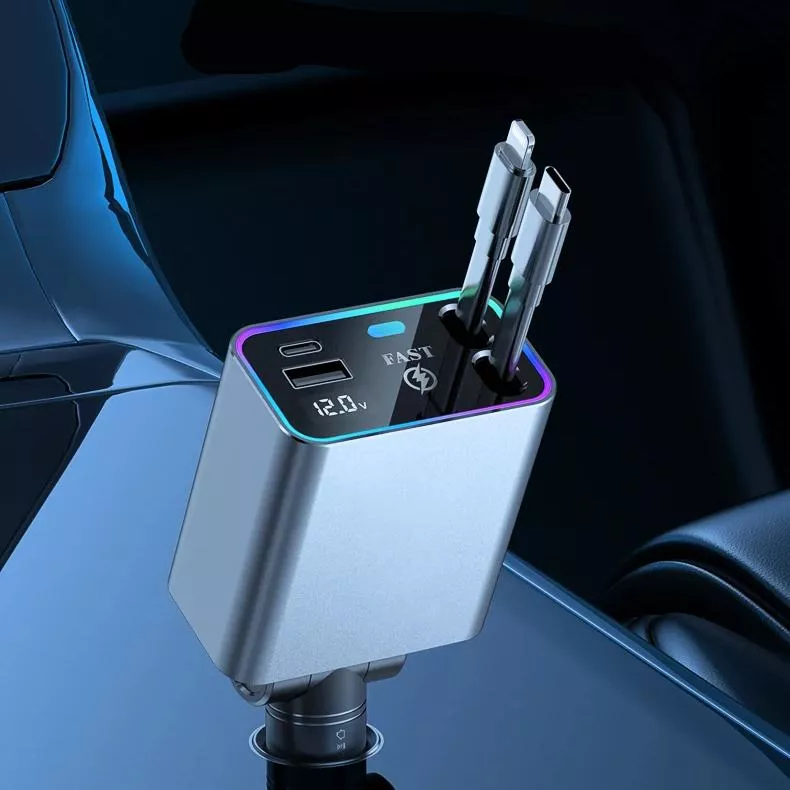 4-in-1 184W Fast Car Charger with Retractable USB-C & USB for iPhone & Android
