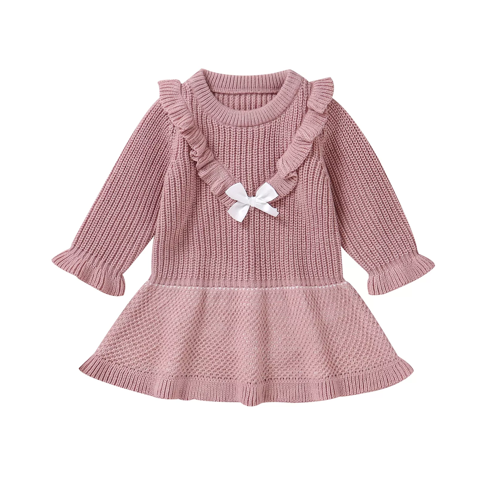 Cozy Knit Baby Sweater Dress with Ruffles & Bow