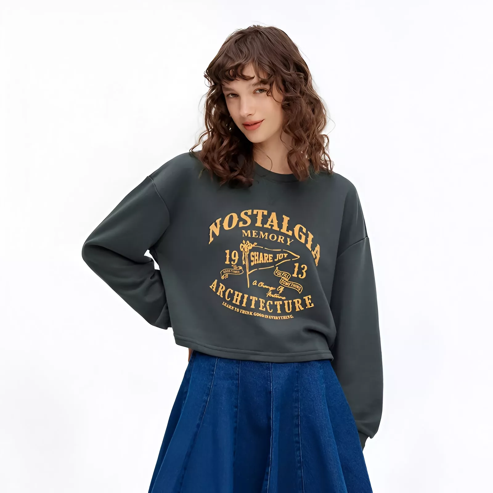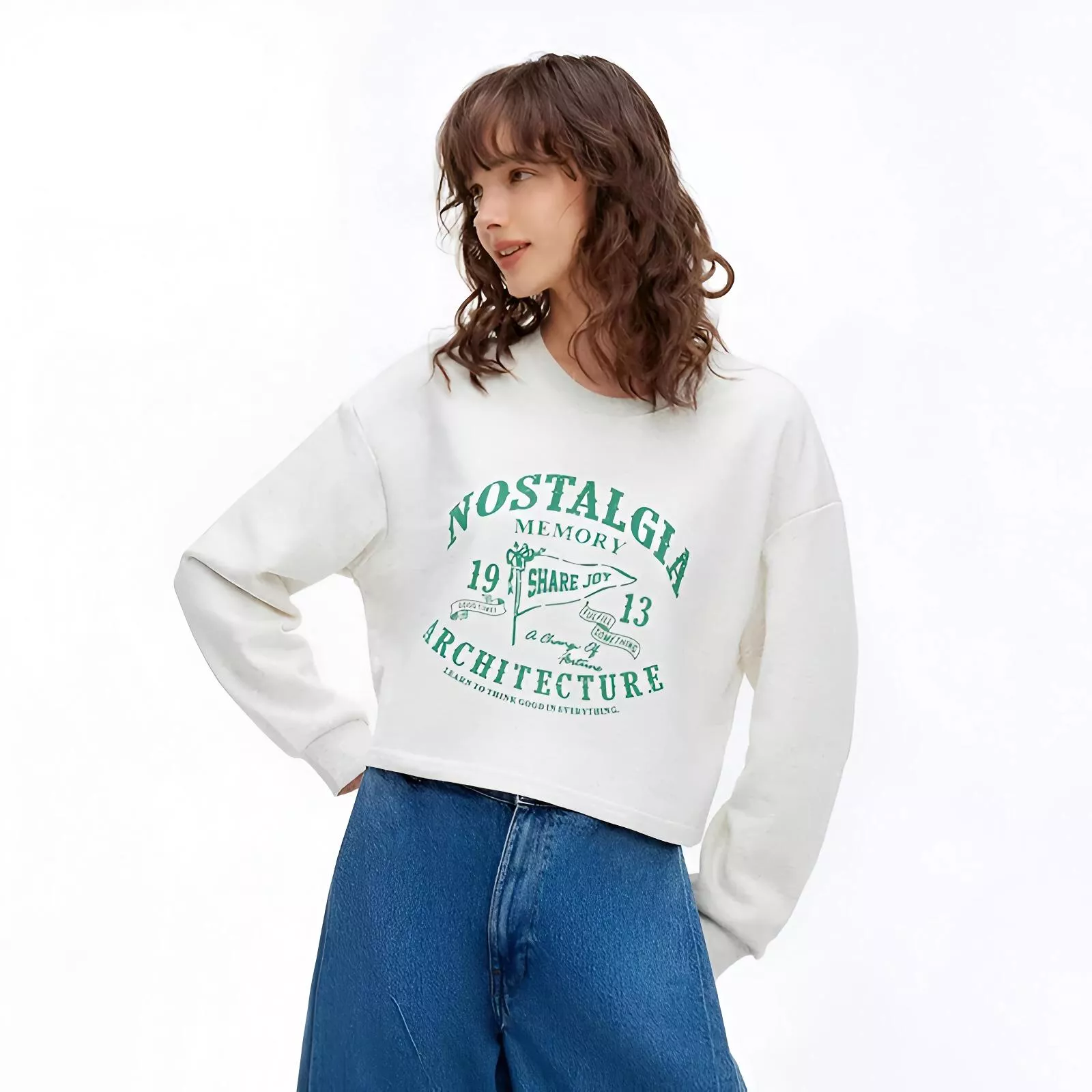 Cropped Vintage Letter Print Hoodie for Women – College Loose Fit
