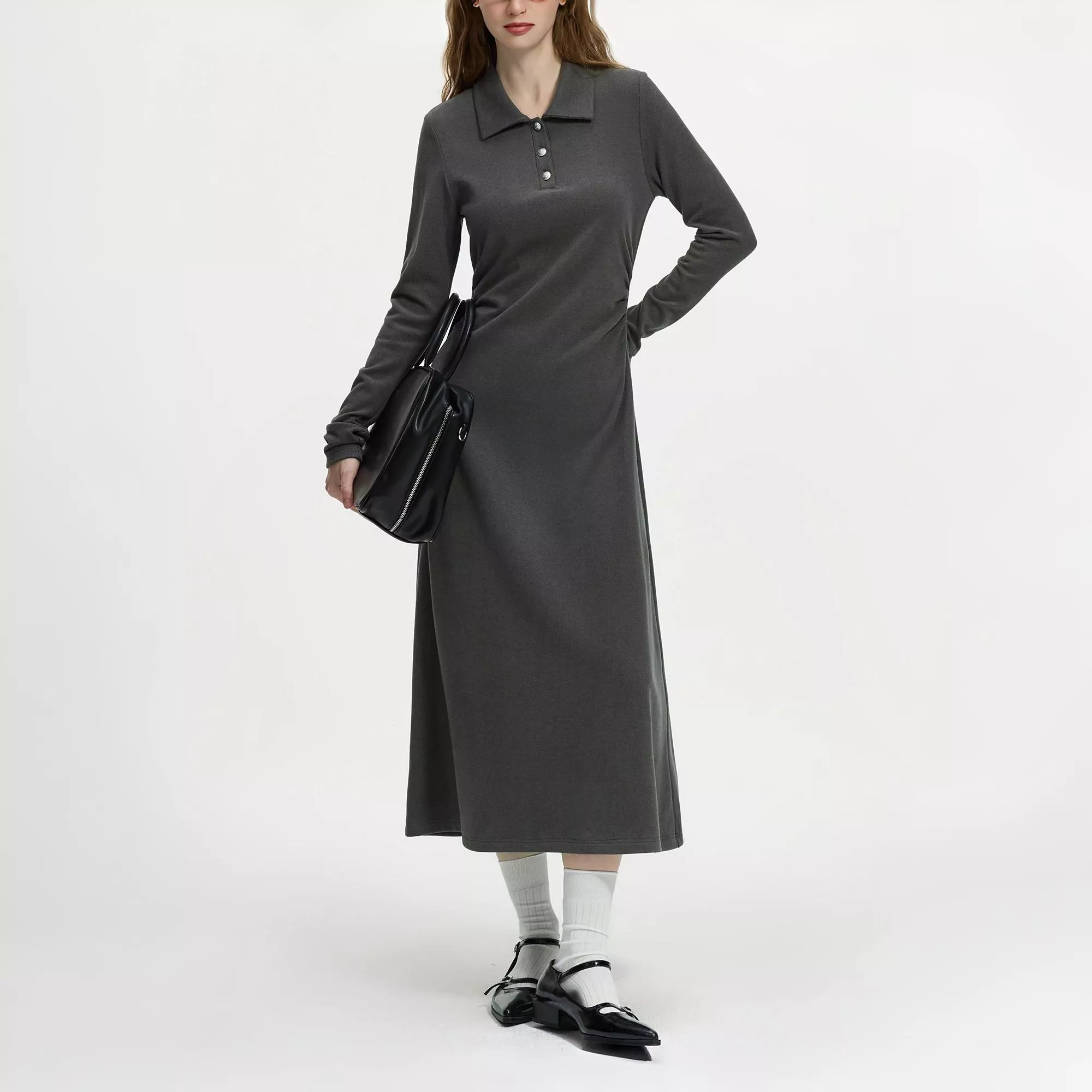 Grey Blue Pleated A-Line Puff Sleeve Polo Neck Dress