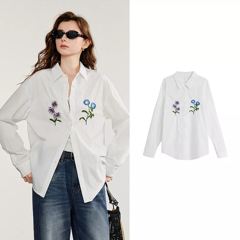 Step into the season with this elegant women’s blouse designed specifically for autumn and winter office wear. Crafted from a soft blend of cotton and nylon broadcloth, this blouse offers both comfort and style. Its crisp white fabric serves as the perfect backdrop for delicate floral embroidery that adds a touch of feminine charm without overwhelming your professional look.