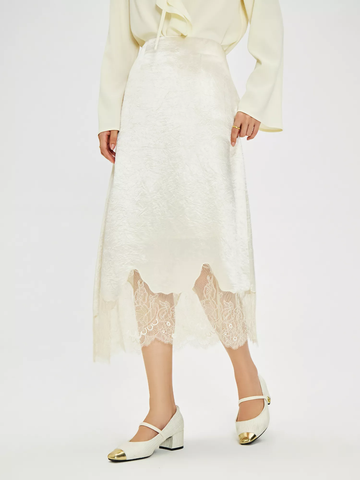 Elegant High Waist Lace Patchwork White Skirt for Women – A-Line Mid-Calf