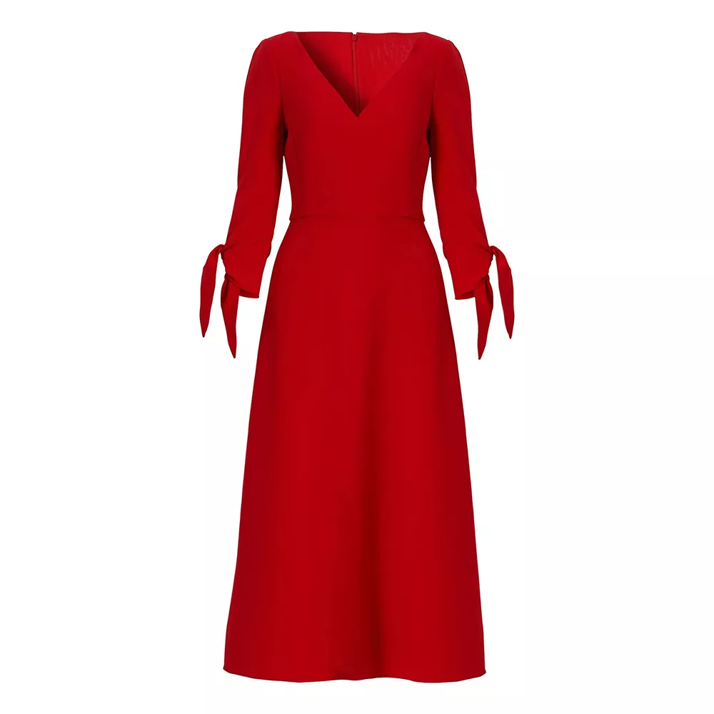 Step into elegance with this beautiful red plus size dress designed to make you feel confident and graceful at any formal event. Featuring a flattering V-neck and half petal sleeves, this mid-calf dress combines comfort with timeless style. The high waist with a charming bow detail adds a feminine touch that enhances your silhouette, creating a perfect A-line shape that suits many body types.