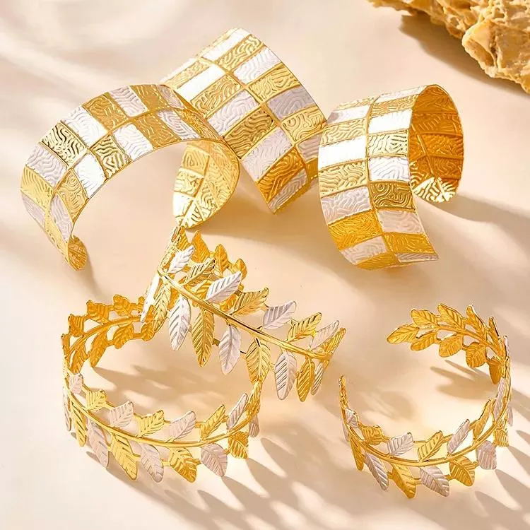 Two-Tone Gold Plated Stainless Steel Leaf Cuff Bracelet for Women