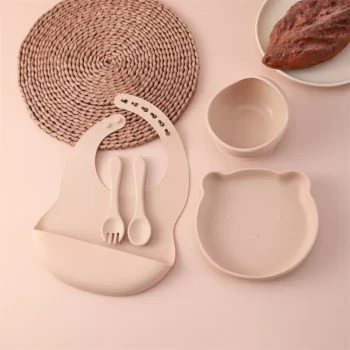 5PCS Silicone Baby Feeding Set – Bear Plate, Bowl, Bib & Training Utensils