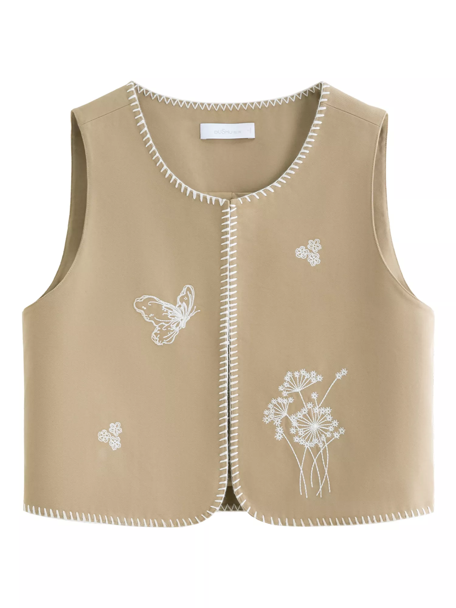 Add a touch of charm to your cold-weather wardrobe with this embroidered vest. Stylish, comfortable, and easy to layer—this is the versatile piece you’ll wear again and again. Don’t wait to refresh your autumn look with this must-have staple.