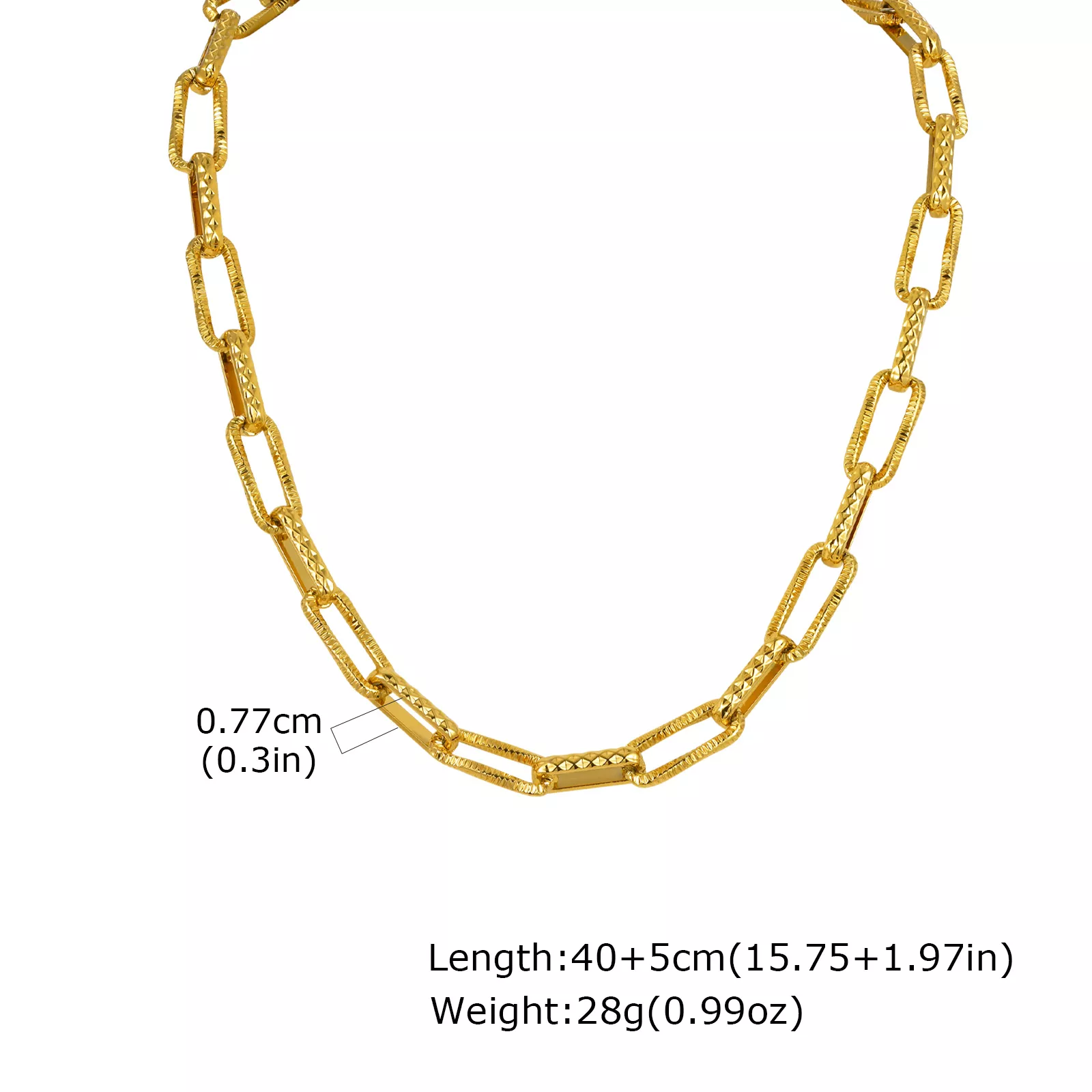 Simple, modern, and irresistibly chic — this gold-plated stainless steel link necklace is the kind of jewelry that speaks volumes without saying a word. Designed in a classic paperclip chain style, this minimalist choker necklace adds a refined edge to any outfit. Whether you’re dressing up for a special night out or adding polish to your daytime look, this trendy piece will instantly elevate your style with its gleaming gold finish and contemporary charm.