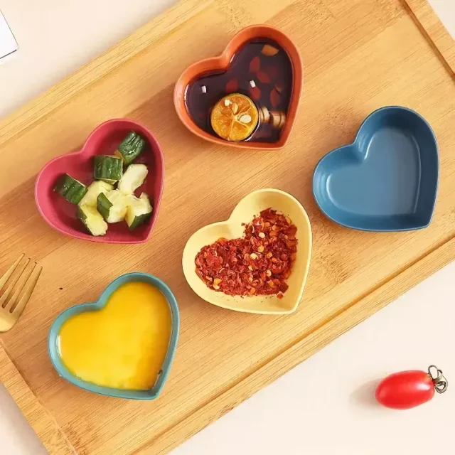 these heart-shaped seasoning dishes are simply delightful. they are made from wheat straw plastic, which makes them both eco-friendly and durable. the heart shape adds a lovely touch to my kitchen and dining table. the size is perfect for holding a variety of seasonings, sauces, and condiments. cleaning them is very easy, and they stack neatly in my cabinets, saving space. i love using them for family dinners, parties, and even everyday meals. they bring a bit of fun and elegance to the table, and my guests always compliment them. these dishes are a fantastic addition to any kitchen, offering both functionality and style. highly recommend them to anyone looking to elevate their dining experience.