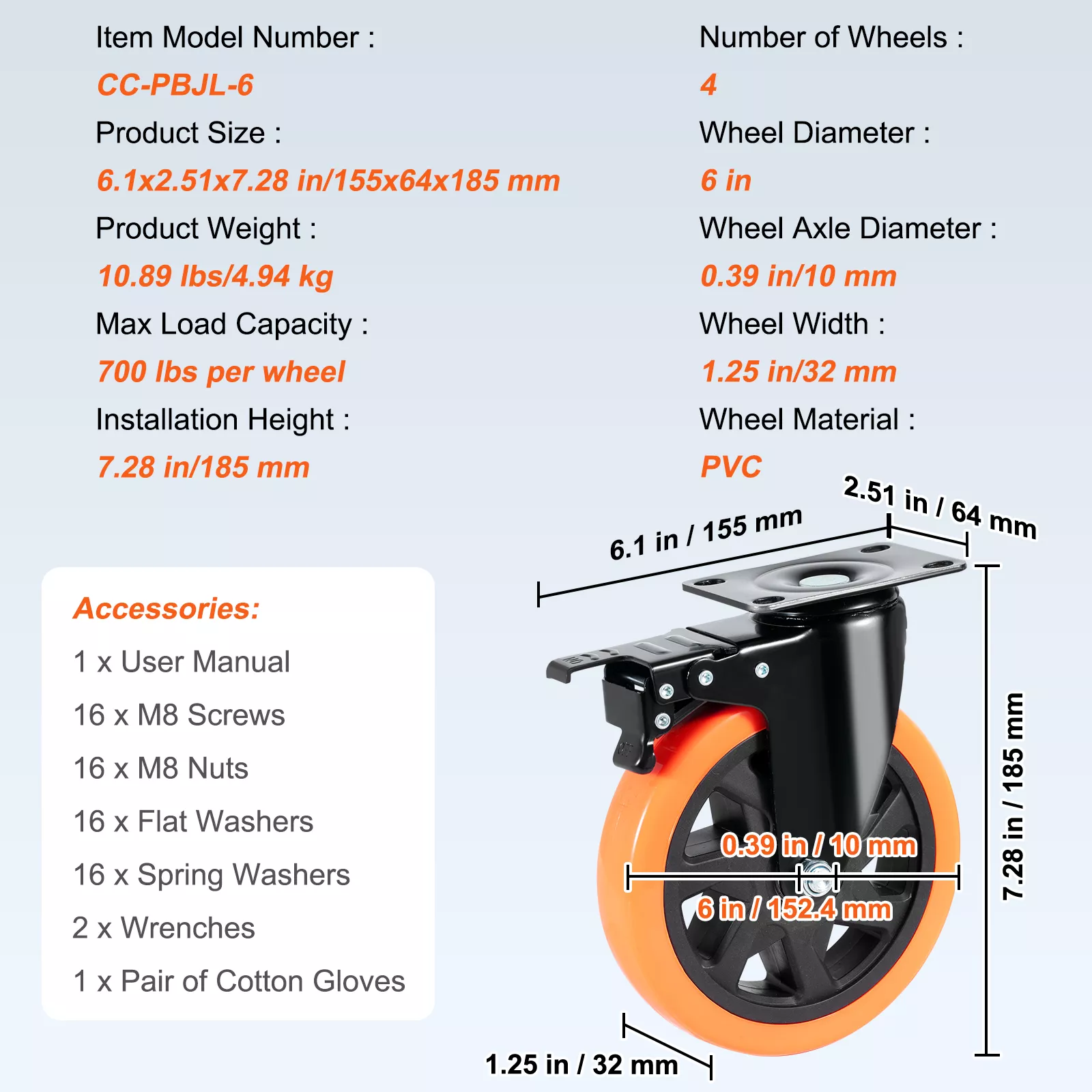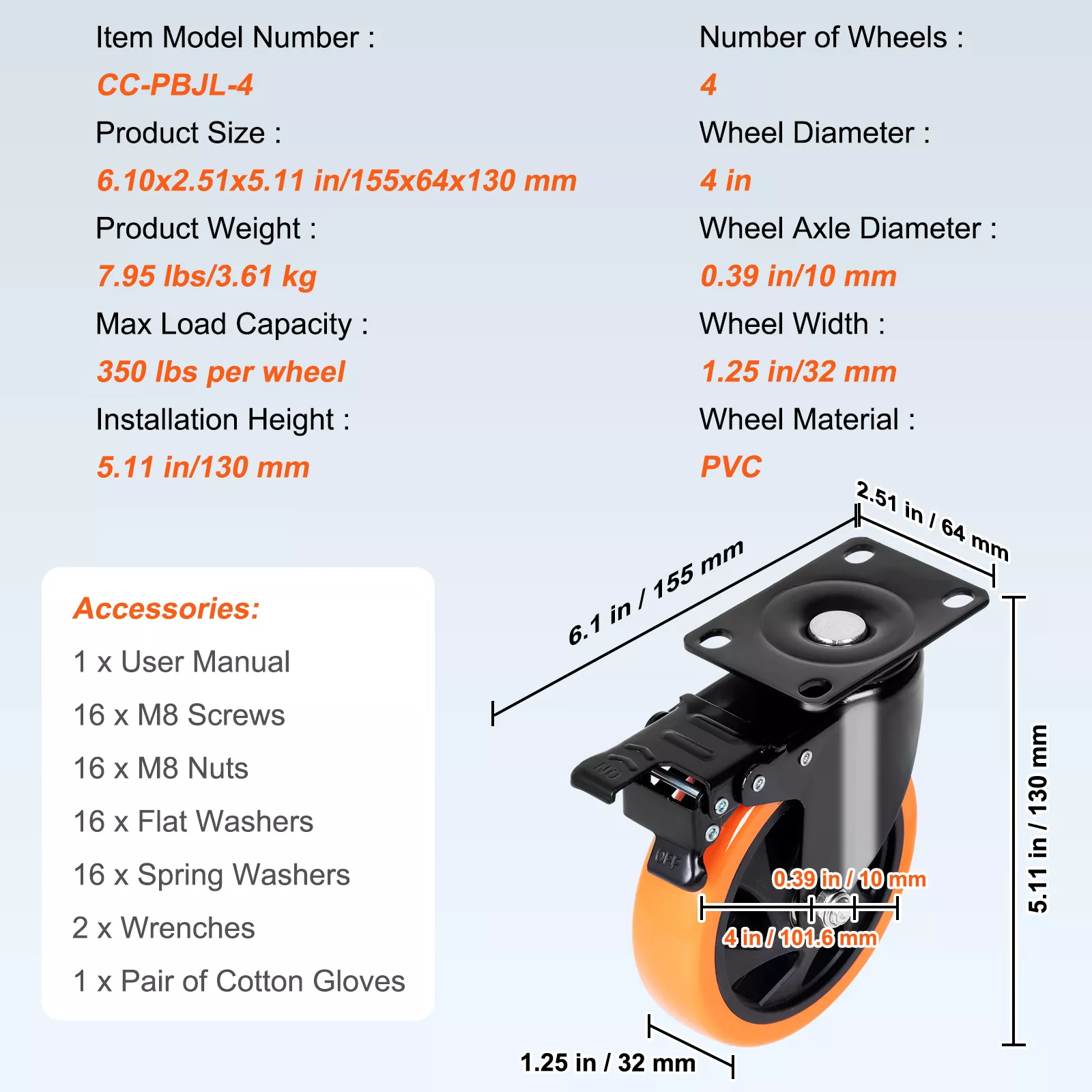 These swivel plate casters are a dream come true for anyone who needs to move heavy items with ease. The dual locking system is genius, providing an unmatched level of stability and safety that I haven't seen in other products. Plus, the 360-degree swivel feature makes navigating tight corners and complex layouts an absolute breeze. I was also impressed by the smooth and quiet rolling; it's clear that the dual ball bearings do their job well in reducing friction and noise. And let's not forget about the durability - these bad boys can support up to 600 lbs per set! The thick carbon steel brackets paired with solid PVC wheels really make this product built to last. Lastly, they've thoughtfully included a complete installation kit which saved me extra trips and hassle.