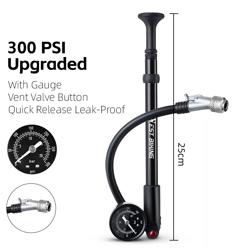 • High Pressure Capability – Inflates up to 300 PSI or 400 PSI, ideal for MTB forks, rear shocks, and tires