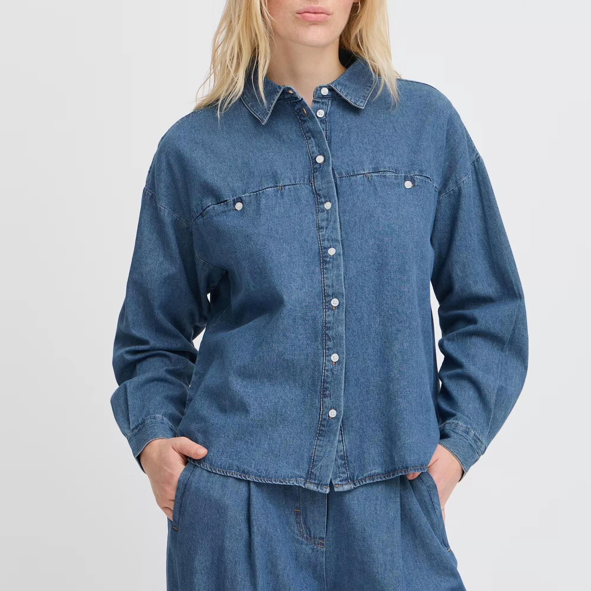 Ichi Women’s Light Blue Button-Down Shirt with Classic Collar and Front Pockets