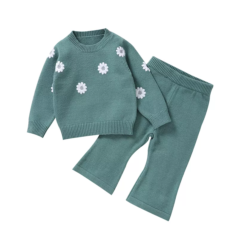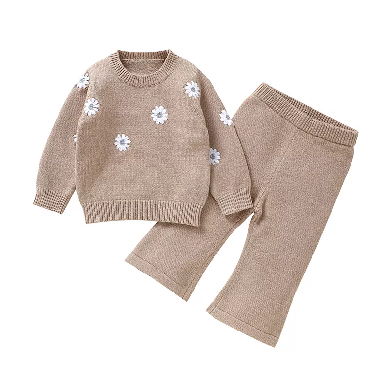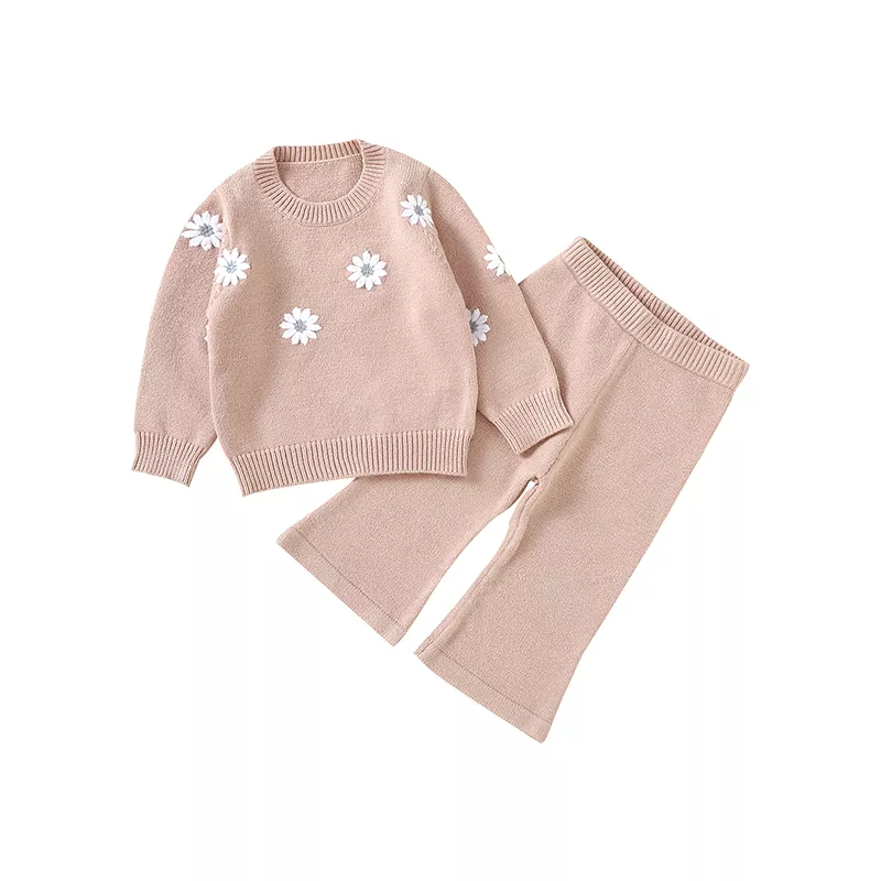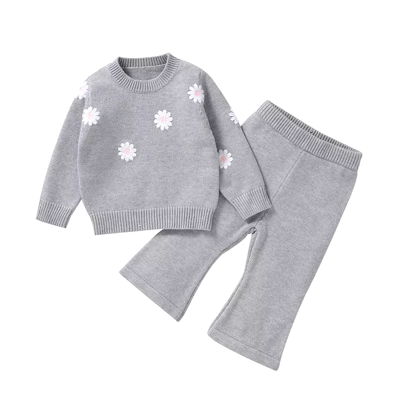 Knitted Baby Girl Outfit Set – Long Sleeve Pullover & Pants with Floral Embroidery
