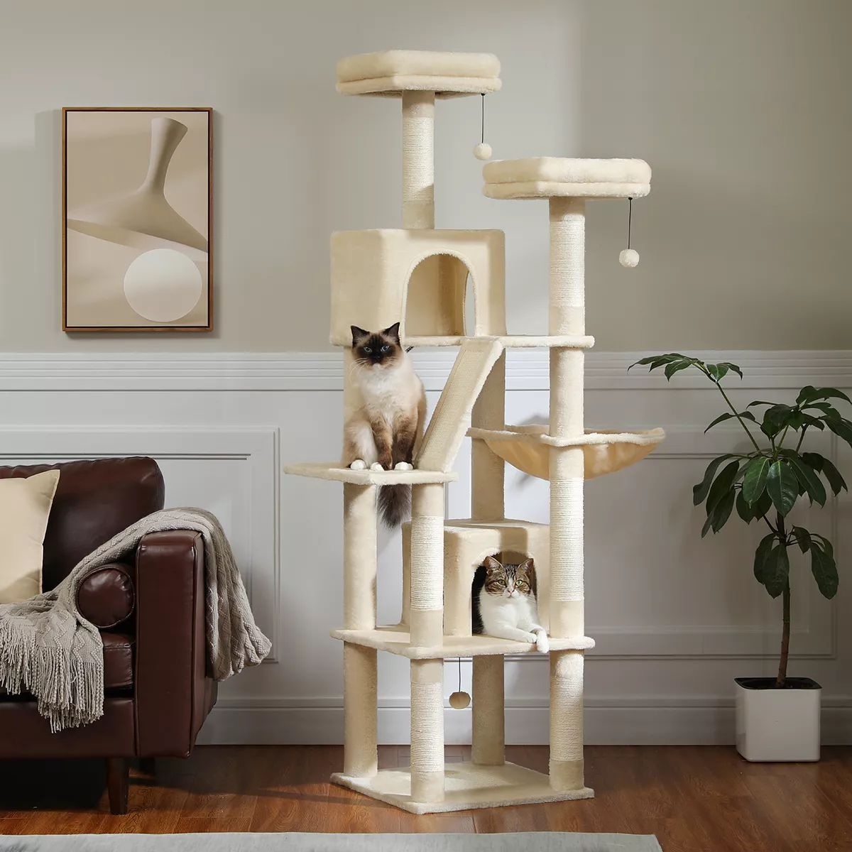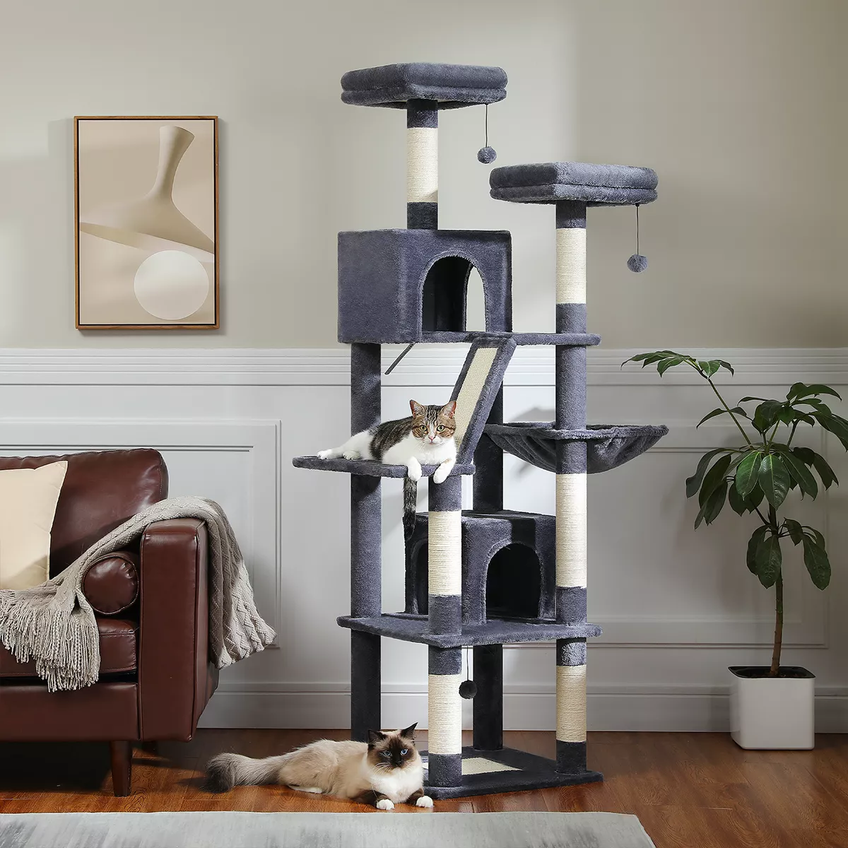 Crafted with multiple levels and plush fabric, this cat tree includes two cozy condos, a deep hammock, six sisal-covered scratching posts, two perches with soft padding, two sisal scratching boards, and even a couple of dangling pompom toys to ignite your cat’s playful spirit. It’s the perfect solution to keep your cats engaged indoors, especially during colder months or in small living spaces.