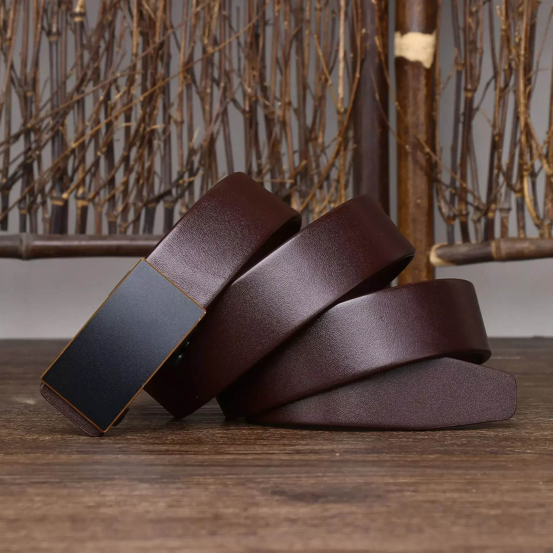 Designed for the man who values both quality and style, this 3.5cm (1.38 inch) wide genuine leather belt is crafted from thick, first-layer cowhide for lasting durability and a luxurious feel. Its toothless automatic buckle offers a sleek, modern look while providing an effortless and adjustable fit. Whether paired with jeans for a refined casual style or worn with dress pants for a professional appearance, this belt delivers timeless sophistication in every setting.