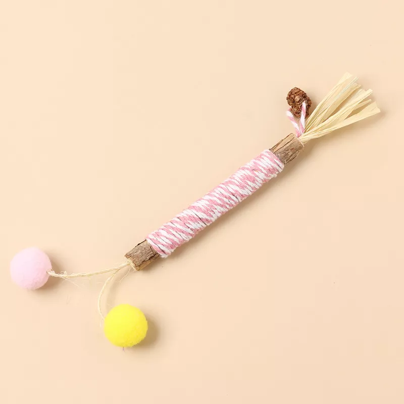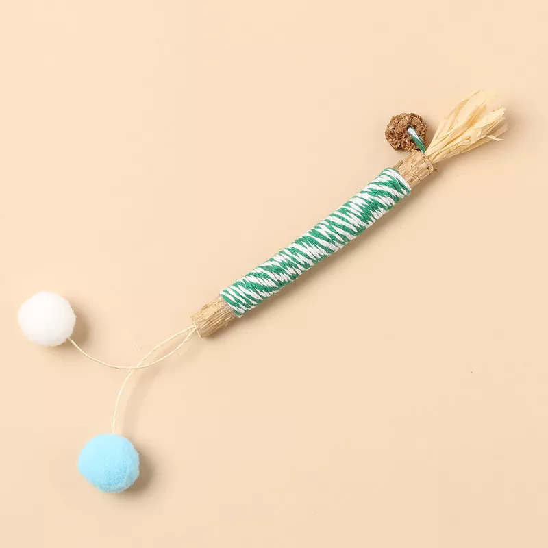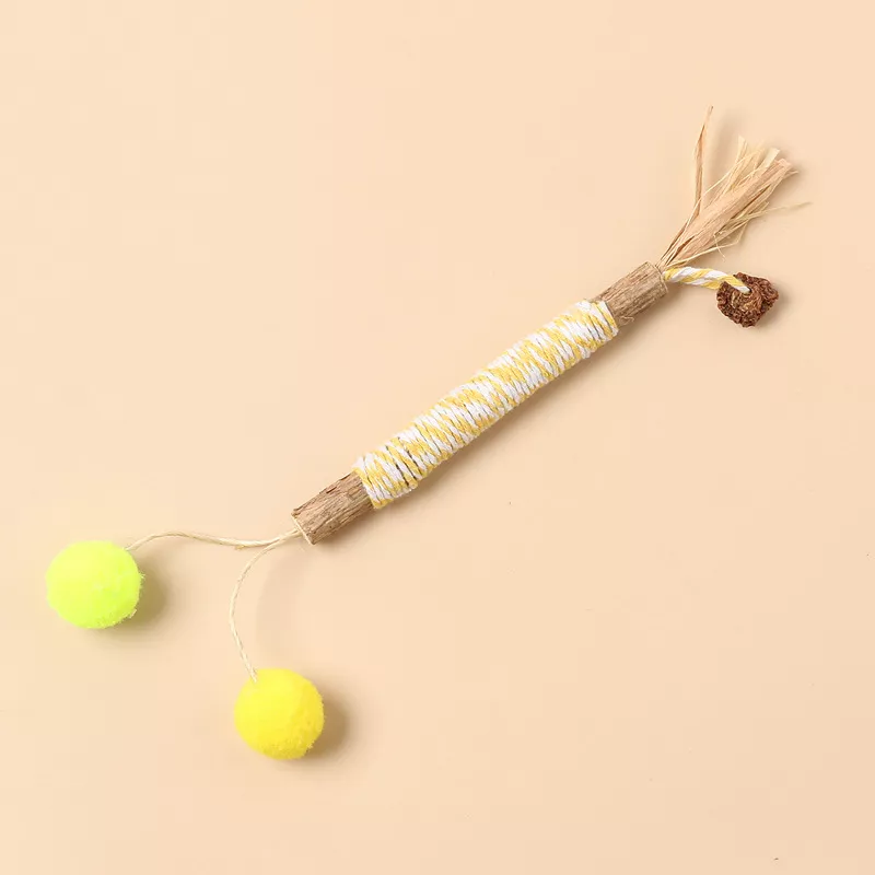 Natural Wooden Cat Chew Stick with Sisal Ball, Feather & Plush for Dental Play