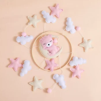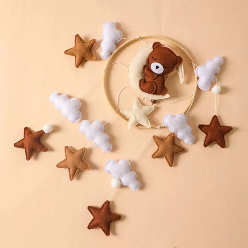 Wooden Crib Mobile with Soft Felt Cartoon Bear Toy – Baby Bed Bell and Rattle Hanger