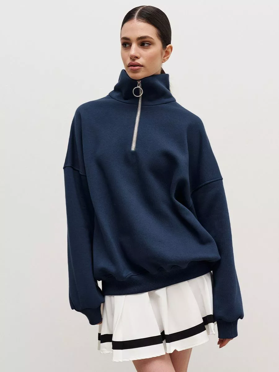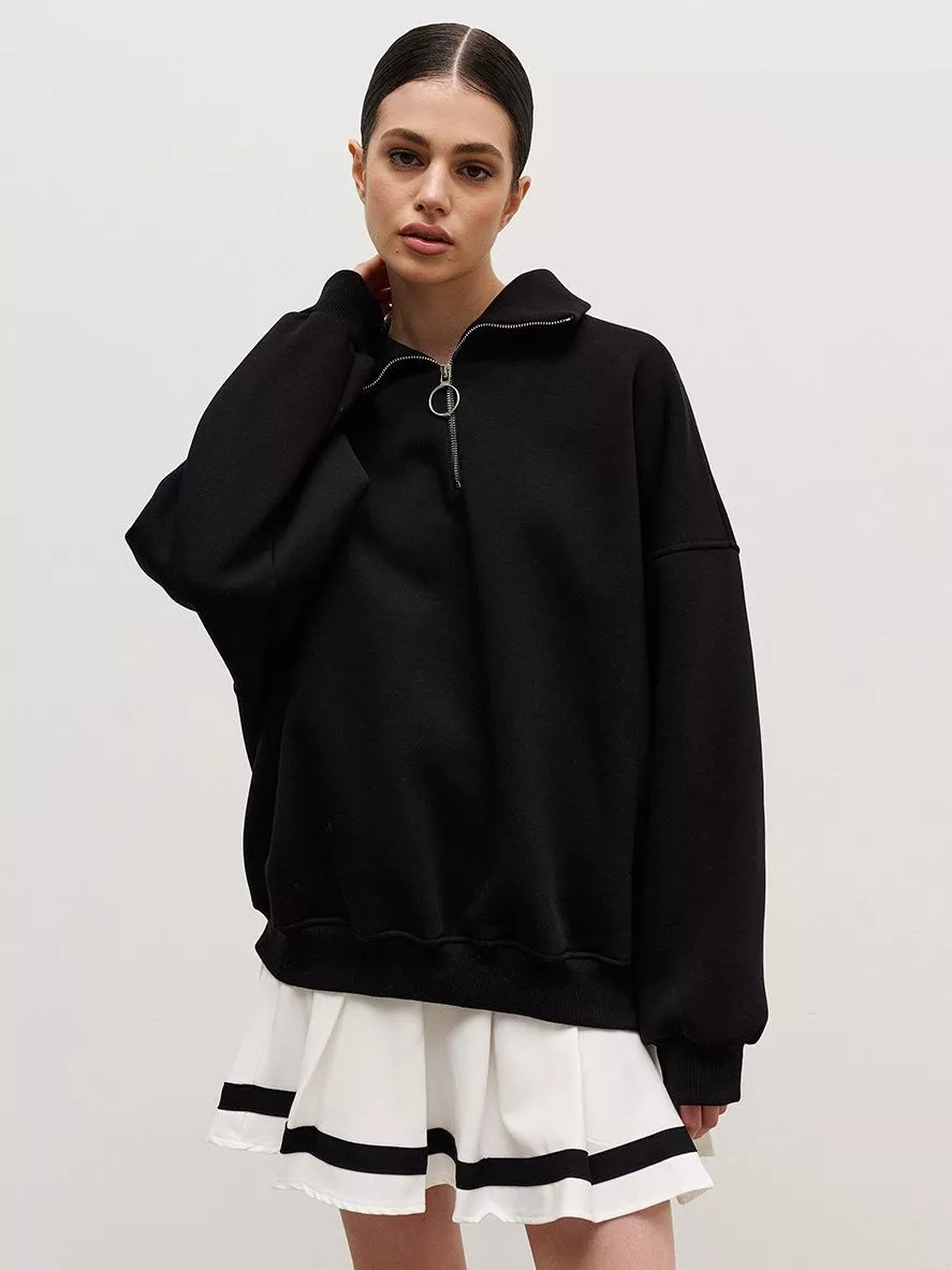 What makes this sweatshirt truly special is the unique combination of its laid-back silhouette with trendy details, like the zipper and lapel collar. This isn’t just another sweatshirt – it’s a fashion-forward statement piece that fits into your everyday life. The fleece material keeps you warm without feeling too heavy, making it ideal for fall and winter wear.