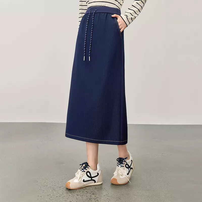 Crafted from a premium blend of polyester, viscose, and spandex, this skirt offers a soft twill texture with just the right amount of stretch for all-day comfort. The natural waistline and straight silhouette flatter your figure, while the eye-catching contrasting drawstring adds a playful, modern twist to the classic denim blue tone.