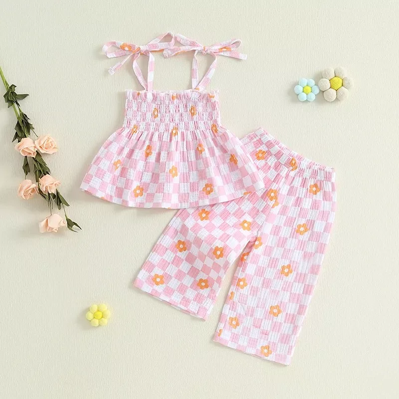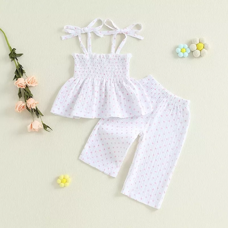 Dress your toddler in the sweetest summer style with this adorable 2-piece outfit. Featuring a lightweight spaghetti strap tank top paired with matching long pants, this set brings playful charm and cool comfort to warm-weather days. The delightful plaid or polka dot prints add a touch of classic cuteness that’s perfect for any occasion — from family outings to everyday play.