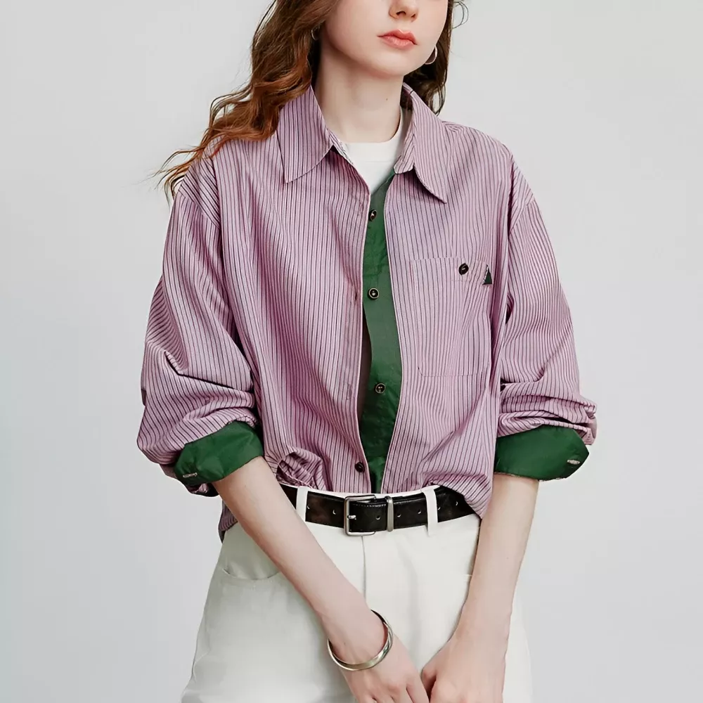 Women’s Retro Cotton Striped Shirt – Contrast Splice Button Down Fall Top