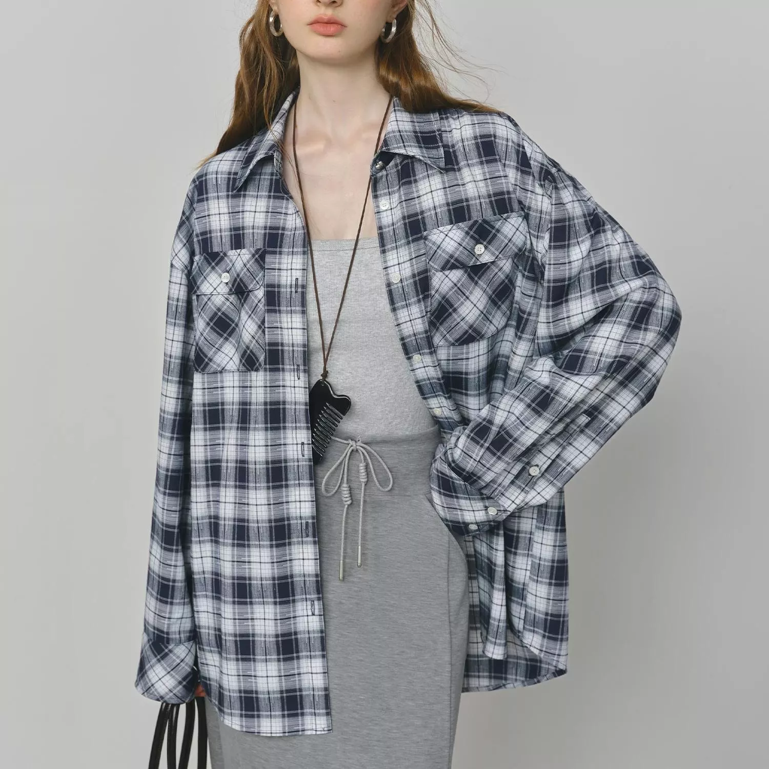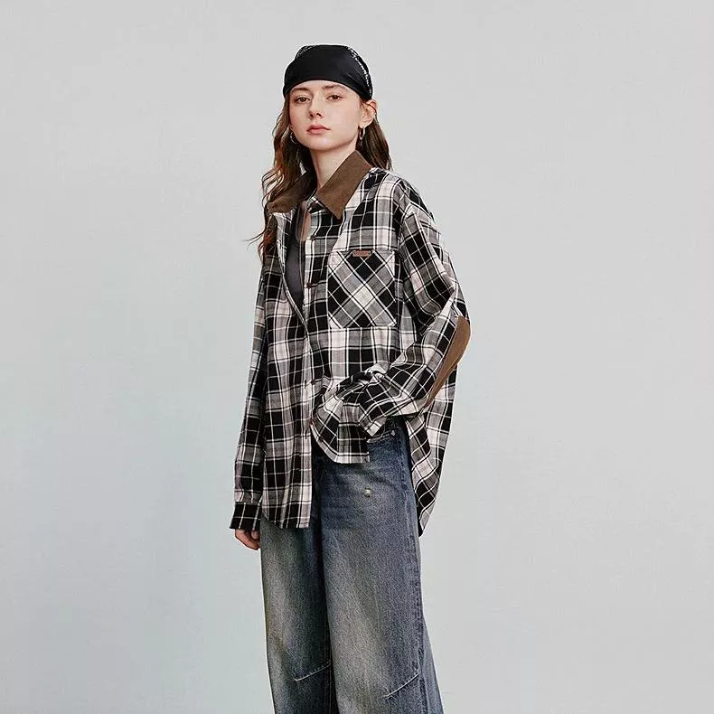 American Retro Plaid Button-Up Shirt with Turn-Down Collar
