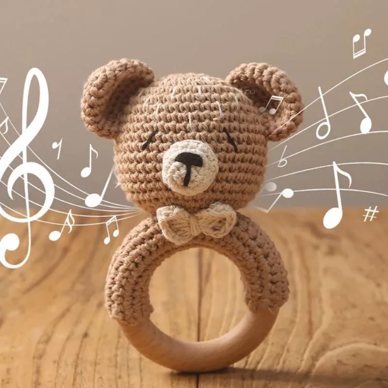 Crochet Animal Bear Baby Rattle & Wooden Teether Ring Toy