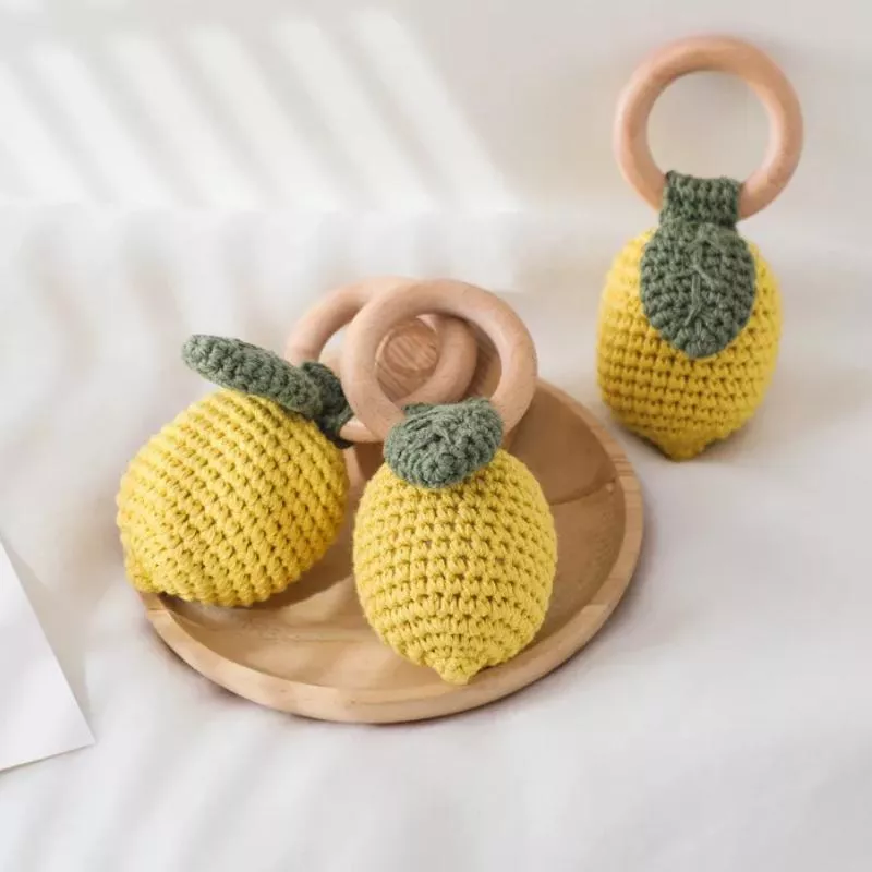 Handmade Baby Lemon Rattle Toy with Wooden Teether Ring – Montessori Baby Toy