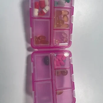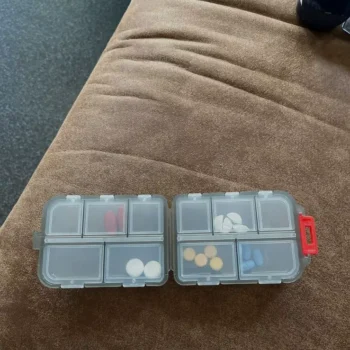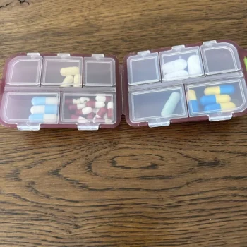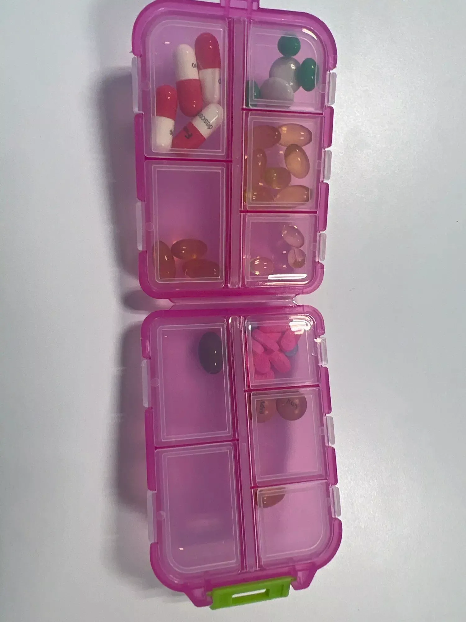 This pill organizer has been a fantastic addition to my travel essentials. It’s compact enough to fit in my carry-on bag but has plenty of space for all my medications. The compartments are clearly labeled and hold a good amount of pills. The lids snap shut securely, so I never have to worry about pills spilling out. It’s also very easy to clean and feels very durable. I’ve used it on several vacations, and it’s made managing my medications so much easier. I love how convenient it is to have all my pills organized in one place, and I never forget to take my medications. The organizer is also easy to open and close, which is great for my arthritis. Overall, I’m very satisfied with this purchase and would highly recommend it to anyone who travels frequently and needs a reliable way to manage their medications.