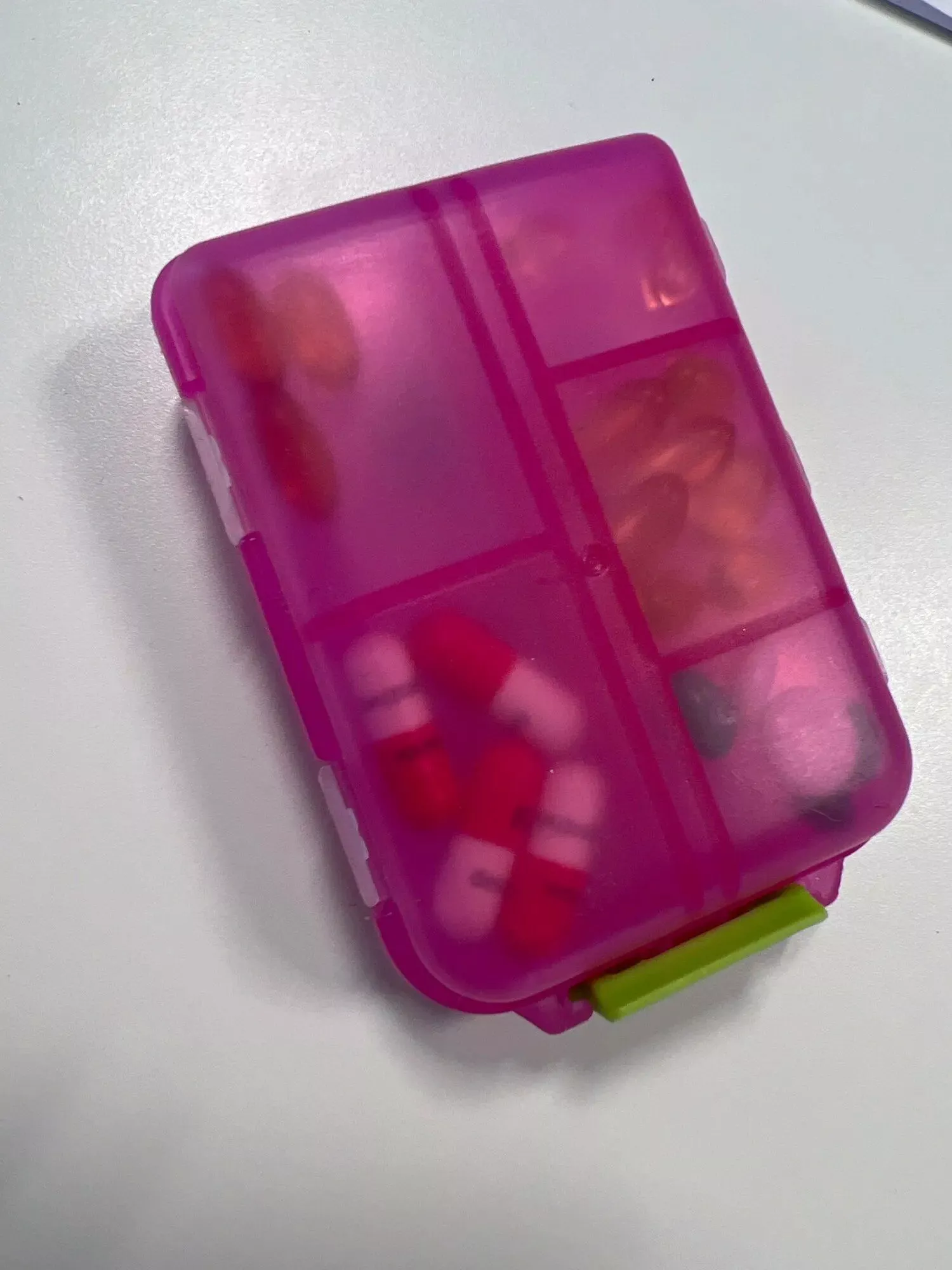 This pill container is not only adorable but also perfectly sized for both your purse and travel needs. Its dual-sided design is particularly useful for keeping medications separate, making it ideal for both yourself and your fiancee. It's a durable option available in various colors and is highly recommended for anyone who takes medication.
