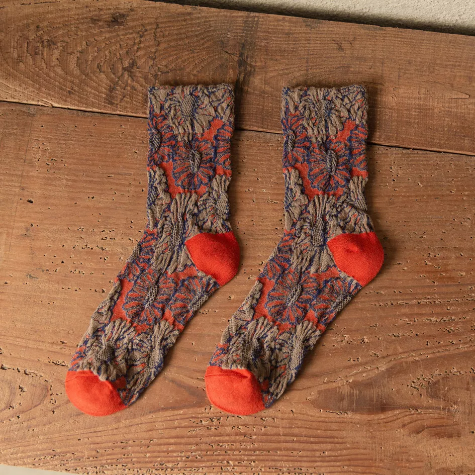 Perfect for autumn and winter, these socks aren’t just about looks — they’re designed to keep your feet cozy and stylish as the temperature drops. The floral pattern adds a soft, feminine flair, while the retro color palette makes them a standout piece in your sock drawer.
