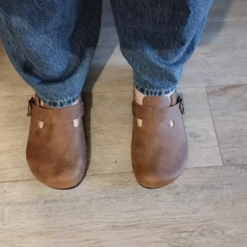 Slip them on and step out with ease thanks to the round-toe design and open heel. The aged leather upper develops a unique patina over time, making each pair truly one-of-a-kind. The antique bronze buckle adds a bold accent while giving you an adjustable fit tailored to your foot shape. Combined with a thick EVA cork sole, these mules are designed for superior comfort and long-lasting support — perfect for all-day wear during spring and summer.