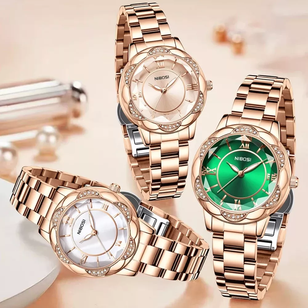 Elegant Rose Gold Rhinestone Women’s Quartz Watch with Stainless Steel Band