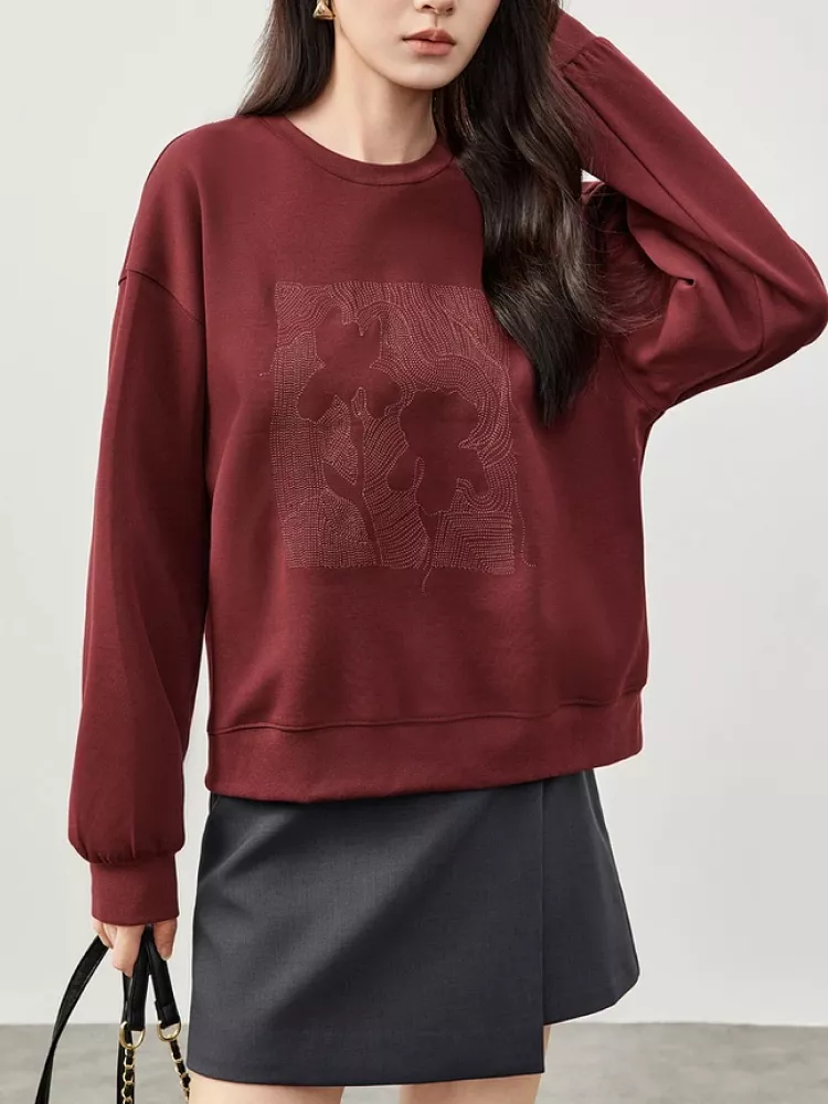 The simple, solid color design is elevated by delicate embroidery details, giving this top a subtle touch of elegance. Its loose fit and long sleeves provide comfort and coverage without sacrificing style. With a classic crew neck and straight hemline, this sweatshirt pairs beautifully with jeans, skirts, or tailored trousers, making it a go-to staple.