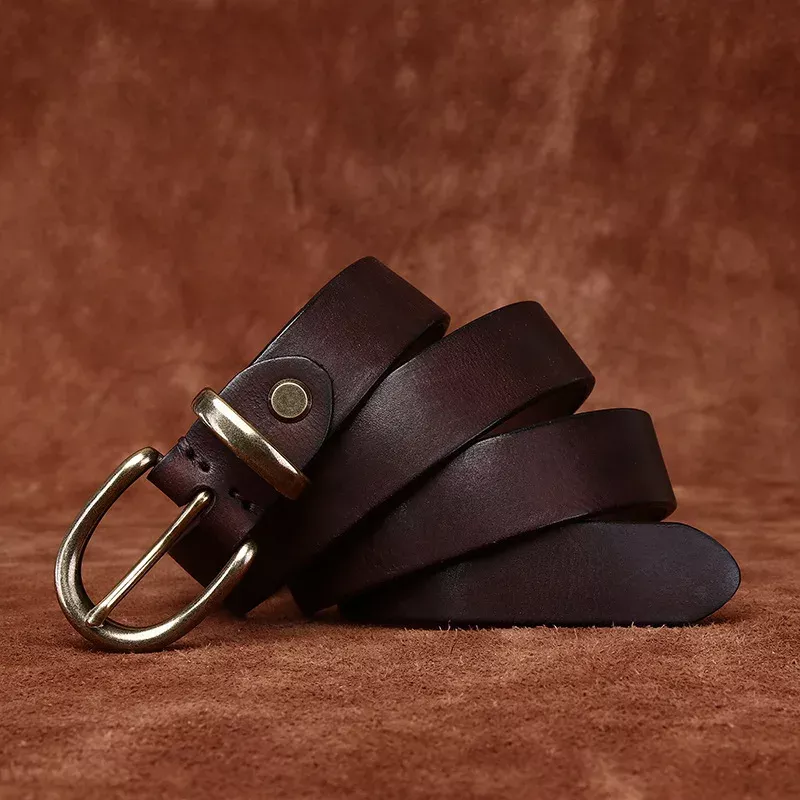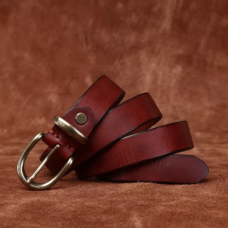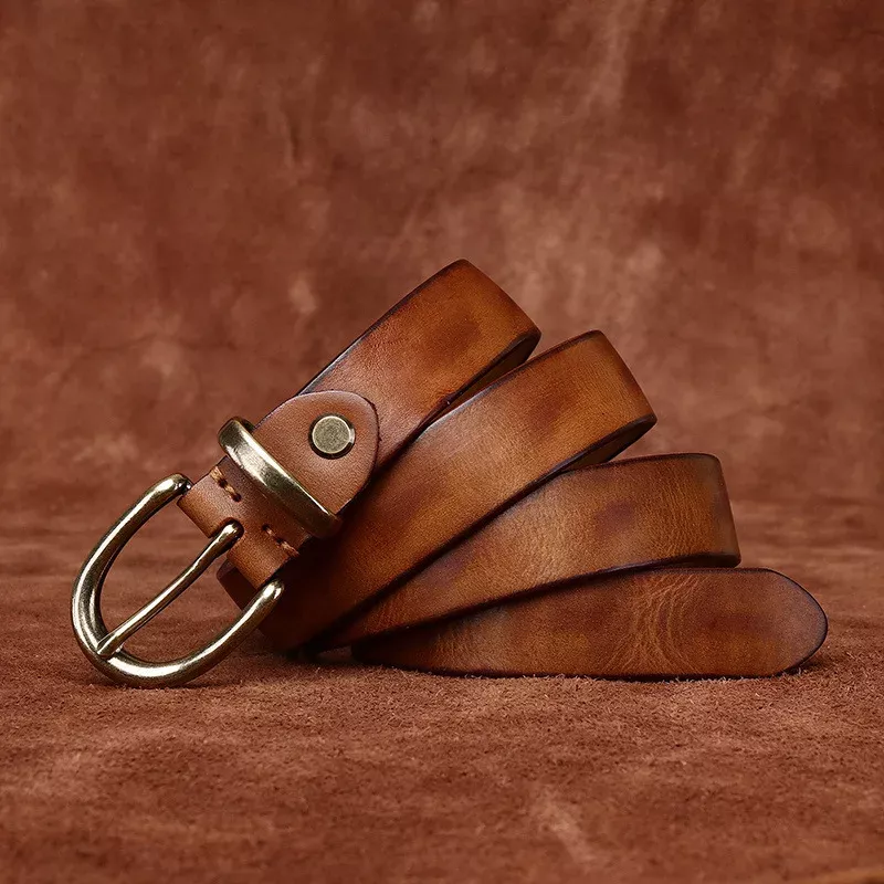 Enhance your outfit with this 2.7cm (1.06 inch) wide genuine leather women’s belt, beautifully crafted from premium first-layer cowhide. With its sleek profile and alloy pin buckle, this belt strikes the perfect balance between casual comfort and timeless sophistication. Each piece is handmade and treated with a special washing and antique dyeing process, giving it a rich, vintage character that stands out from ordinary accessories. Available in versatile shades like black, brown, red-brown, and khaki, it’s the perfect finishing touch to both everyday and special looks.