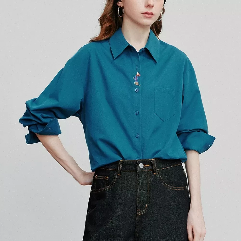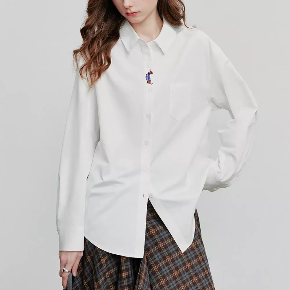 Women’s Long Sleeve Cotton Shirt with Dog Embroidery – Autumn Office Casual