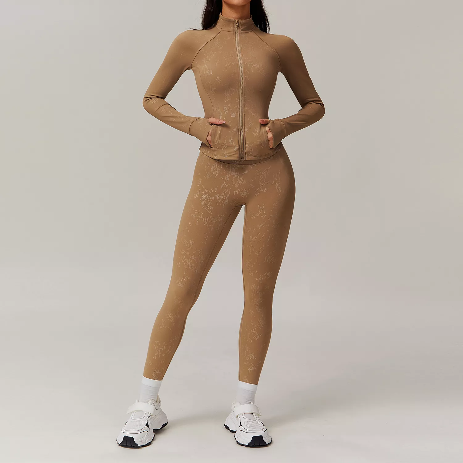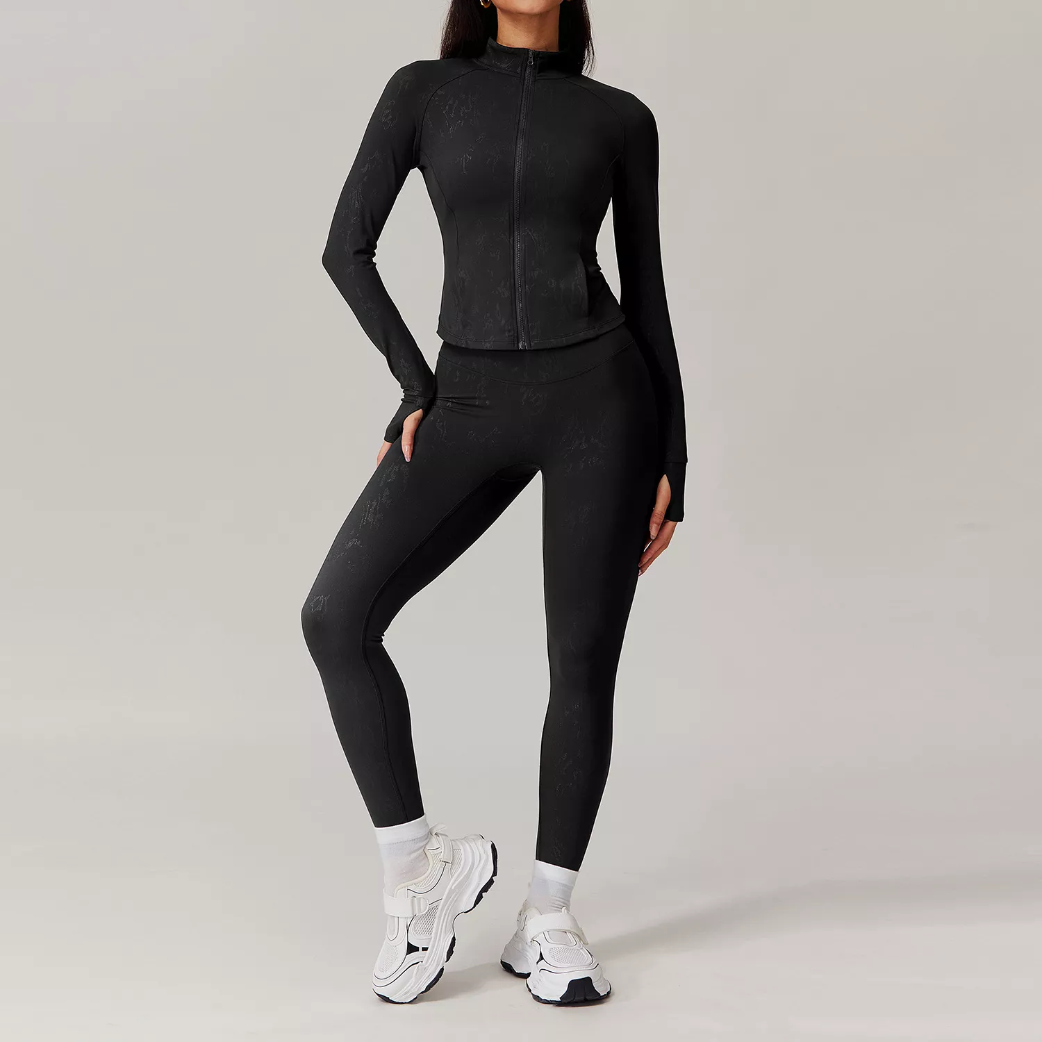 The quick-dry, breathable fabric keeps you cool and comfortable, while its anti-shrink and compression qualities ensure a snug yet flexible fit. The leggings feature a push-up, scrunch-butt design that enhances your silhouette, and the jacket’s slash pockets add a touch of convenience for your essentials. Whether indoors or outdoors, this versatile tracksuit helps you look and feel your best while moving freely.